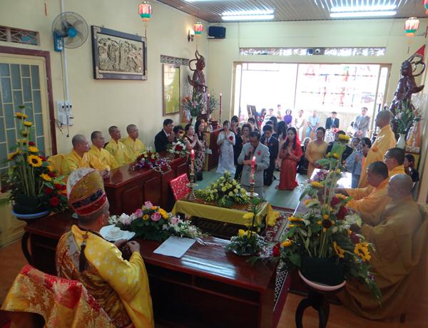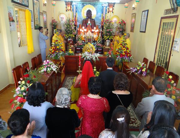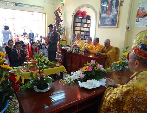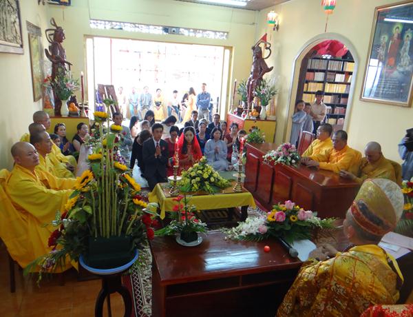 Tại Đại hùng Bảo điện, chư tôn đức tăng đã làm lễ niêm hương bạch Phật, đảnh lễ Tam Bảo, kỳ an chúc phúc … Giờ phút quan trọng nhất của buổi lễ đó là thời pháp thoại của Thượng tọa chứng minh nhắc nhủ đôi tân lang – tân nương về ý nghĩa của lễ Hằng Thuận : “ mượn những điều dạy của Đức Phật trong kinh Thiện Sanh, pháp Lục Hòa trong Thiền môn, Ngũ giới của người Phật tử để biết giữ gìn bổn phận của người vợ, người chồng, phải biết yêu thương, nhường nhịn, giữ gìn để tình cảm luôn bền vững, tốt đẹp . Vợ chồng phải biết tôn trọng, lắng nghe để thấu hiếu nhau. “Thuận vợ, thuận chồng tát biển Đông cũng cạn”, có hòa hợp thì mới có thể sống với nhau lâu dài và vượt qua nhiều khó khăn, thử thách trong cuộc sống . Đồng thời, cũng phải biết giữ đạo làm con, làm cháu, biết quan tâm, chăm sóc, phụng dưỡng cho cha mẹ, ông bà lúc tuổi già, không nên chỉ lo xây dựng tổ ấm của mình mà quên đi trách nhiệm, bổn phận với tổ tiên, dòng họ.
