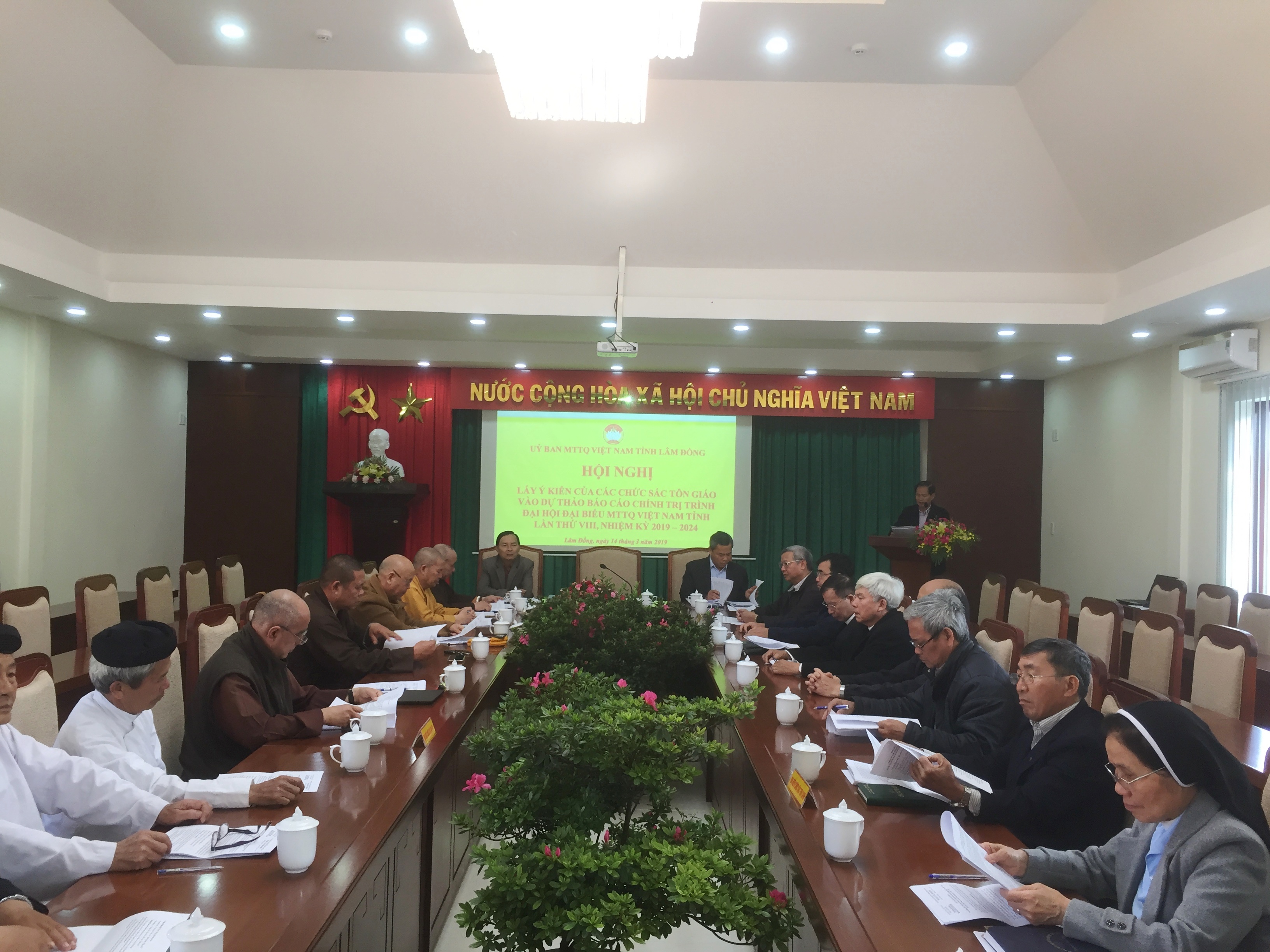 Chủ trì hội nghị có ông : Nguyễn Trọng Ánh Đông – UVBTV Tỉnh ủy, Chủ tịch UBMTTQ tỉnh; ông Đường Anh Ngữ – Phó Chủ tịch TT. UBMTTQ tỉnh; ông Trương Thành Được – Phó Chủ tịch UBMTTQ tỉnh . Tham dự hội nghị còn có đại biểu; đại diện 4 chức sắc tôn giáo : Phật giáo, Công giáo, Tin lành, Cao Đài trên địa bàn tỉnh Lâm Đồng.