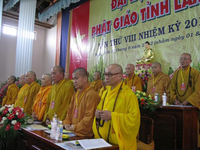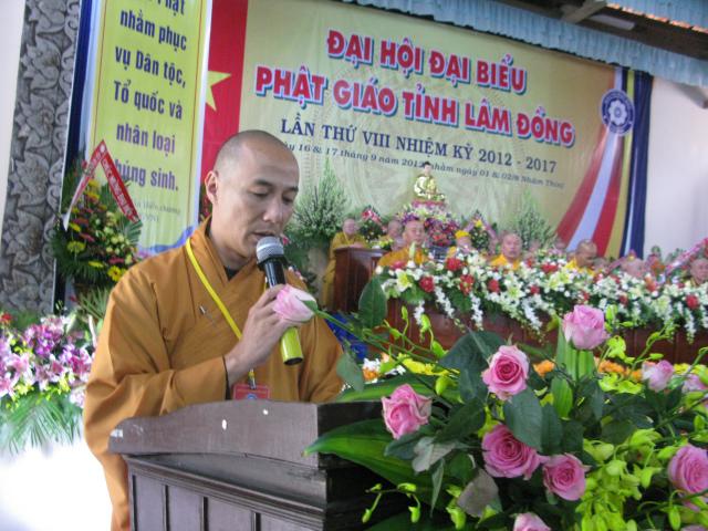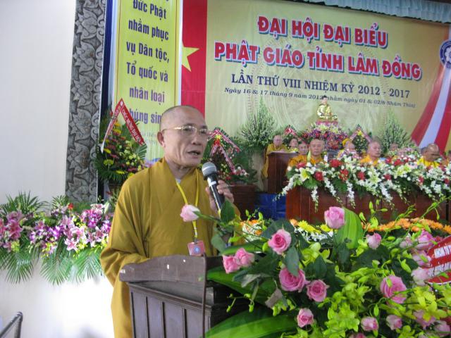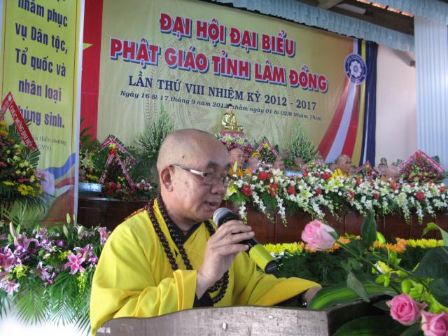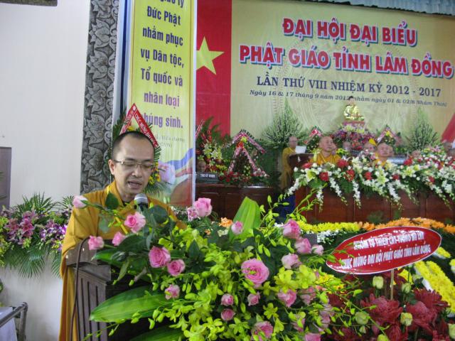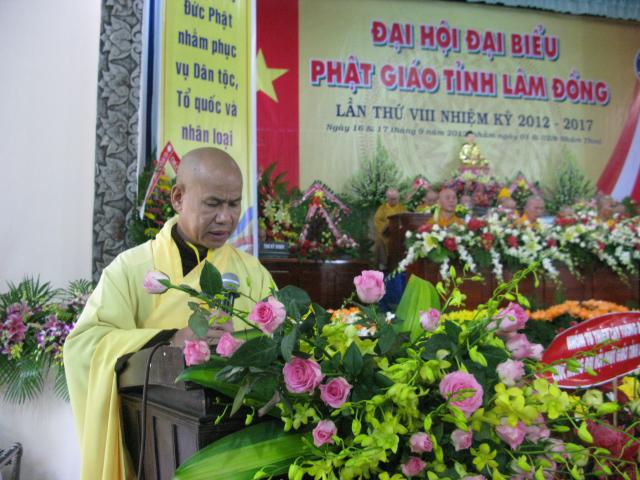 Đại hội còn lắng nghe lời phát biểu chân tình của ông Phạm Kim Khang UV. Ban thường vụ Tỉnh ủy, chủ tịch UBMTTQVN tỉnh Lâm Đồng ghi nhận, hoan nghênh những thành tích, những đóng góp không nhỏ của Tăng, Ni , Phật tử tỉnh nhà qua các Phật sự thiết góp phần cùng các cấp chính quyền xây dựng quê hương Lâm Đồng ngày một phát triển tốt đẹp . Thành công của Đại hội hôm nay thể hiện tinh thần đoàn kết gắn bó của các thế hệ Phật giáo trong tỉnh và mong rằng trong nhiệm kỳ tới BTS sẽ phát huy hơn nữa những truyền thống quí báu của văn hóa Phật giáo Việt Nam . Tham gia các phong trào thi đua yêu nước, gắn việc thực hiện nhiệm vụ hoằng dương chánh pháp với việc xây dựng nếp sông văn hóa mới . Phát huy truyền thống “ hộ quốc an dân”, xứng đáng với niềm tin, lòng tự hào của Phật tử và nhân dân trong tỉnh, thực hiện tốt phương chăm “ Đạo pháp dân tộc – Xã hội chủ nghĩa”