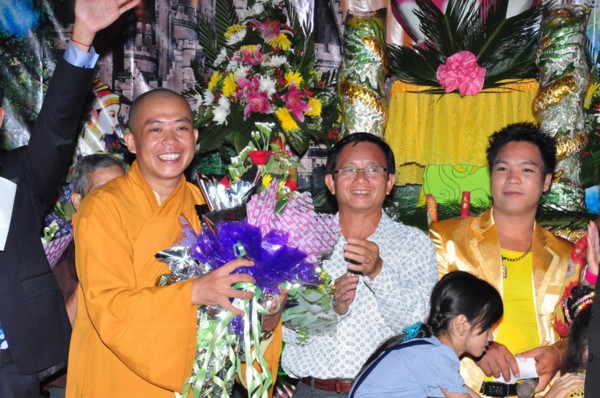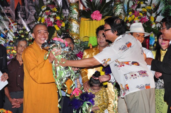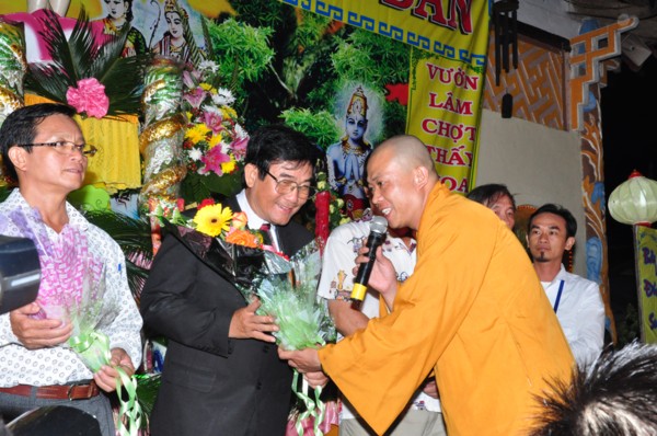 Đại đức trụ trì tặng hoa cho Nhạc sĩ Chúc Linh trình bày sáng tác “Quán Thế Âm Bồ Tát”