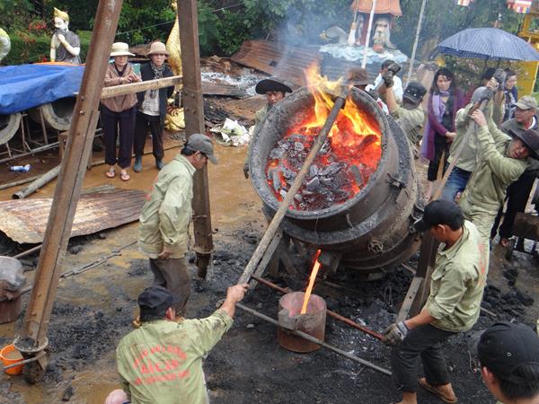 Nghệ nhân Hồ Đắc An ( chủ cơ sở đúc đồng Đắc An ) cho biết, gia đình anh đã có 3 đời theo nghề truyền thống từ phường đúc đồng Cố đô Huế , riêng anh thì năm lên 10 tuổi đã chập chững bước vào nghề ( công việc được giao đầu tiên là đạp đất ) . Theo anh Đắc An, để thực hiện, chế tác một quả đại hồng chung như thế này thì cần phải có thời gian khoảng 2 tháng với 12 tay thợ lành nghề ( điều kiện thời tiết phải thuận lợi , không mưa) . Nhóm nghệ nhân sẽ thực hiện nhiều công đoạn như : nhào đất ( đất sét, than bột, trấu) , lên khuôn, cùm, nén ( gia cố bên ngoài) , đấp cốt, chế tác phần nềm, trang trí hoa văn, hâm nóng, rót đồng, làm nguội ( đánh bóng) .