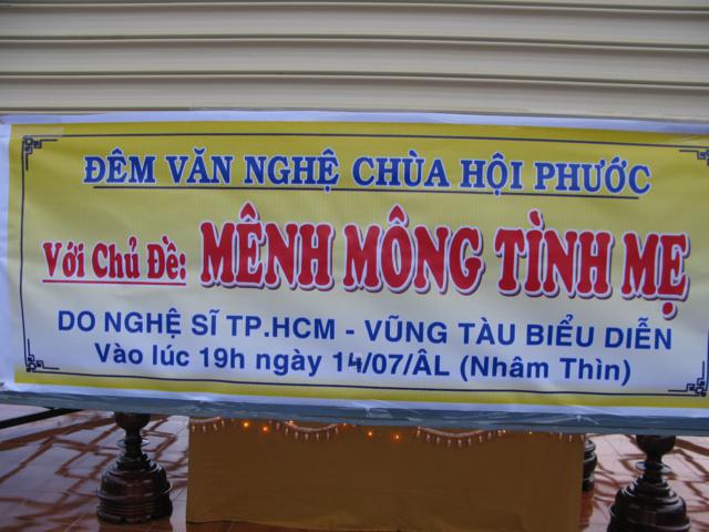 Xin trân trọng giới thiệu chùm ảnh của đêm văn nghệ mà nhóm PV chúng tôi ghi nhận được thay cho lời cảm ơn của chư Tăng, bà con phật tử, đồng bào địa phương ở vùng quê xa xôi đã lâu lắm rồi mới được thưởng thức một đêm lắng lòng cùng âm nhạc dưới ánh trăng tròn mùa báo hiếu Vu Lan tại chùa Hội Phước .
