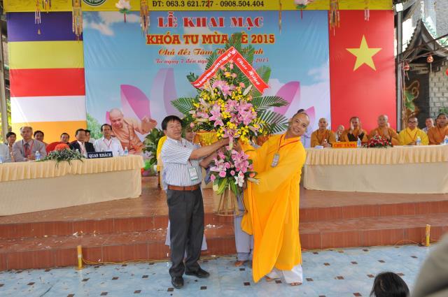 V ĐĐ. Thích Trí Định, trưởng BTC khóa tu nhận lẵng hoa chúc mừng của Đảng ủy, HĐND, UBND, UBMTTQ TT. Thạnh Mỹ trao tặng.