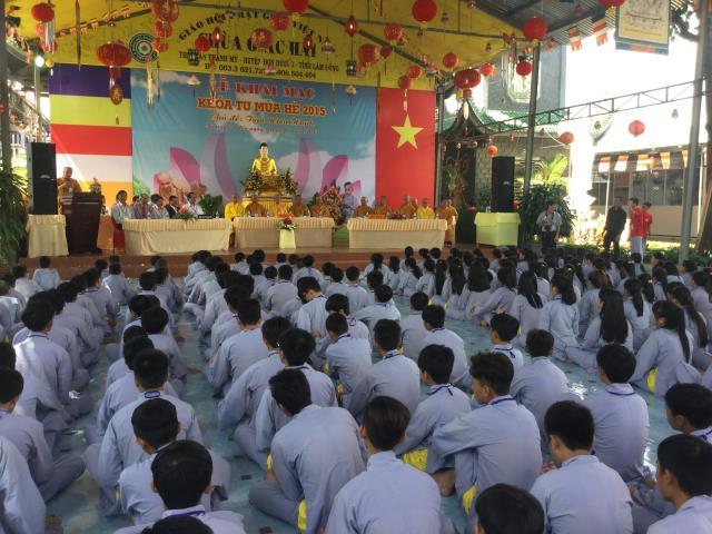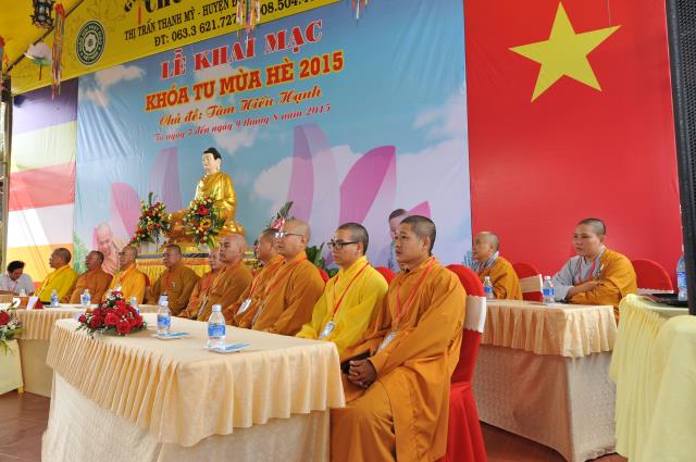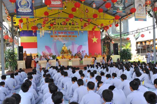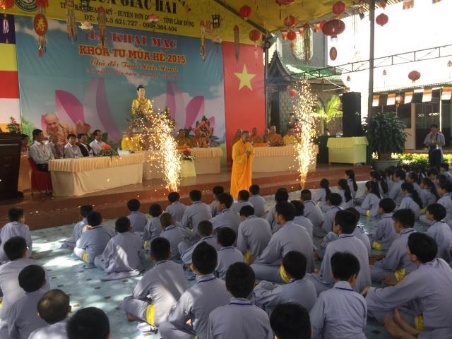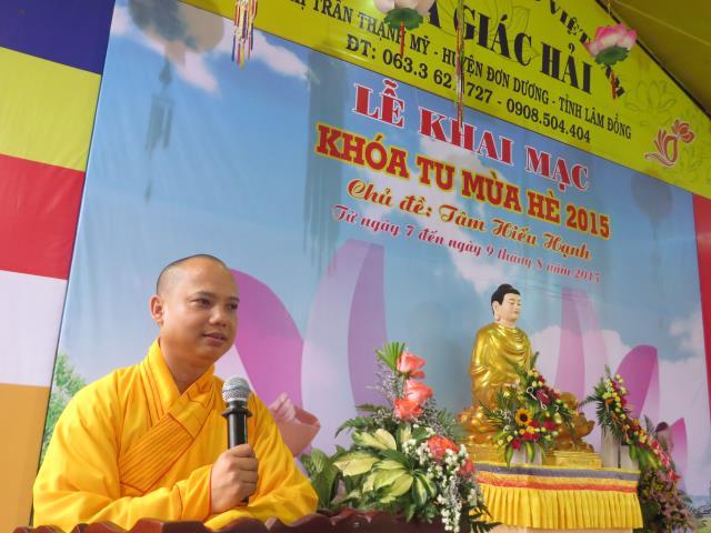ĐĐ. Thích Trí Định, trưởng BTC khóa tu thay mặt chư tôn đức tuyên đọc diễn văn khai mạc. Đại đức nhấn mạnh: “Thực hiện phần nào thông điệp của đức Pháp chủ gởi tăng ni Phật tử trong đại lễ Phật đản PL. 2559, khích lệ các em tiếp cận với giáo lý Phật giáo, một nền tảng đạo đức chính của nhân loại, góp phần đẩy lùi và giúp các em xa rời các tệ nạn, hướng các em vào quỹ đạo sống hướng thượng, đạo đức, góp phần định hướng giáo dục giới trẻ về tinh thần yêu quê hương đất nước, lòng tri ân và báo ân đối với ông bà cha mẹ, thầy cô giáo, giữ gìn bản sắc văn hóa dân tộc, tham gia các công tác từ thiện xã hội, ý thức bảo vệ môi trường sống, làm tiền đề cho những sinh hoạt lành mạnh của tuổi trẻ sau này, cống hiến sức trẻ của mình trong việc xây dựng và bảo vệ tổ quốc”.