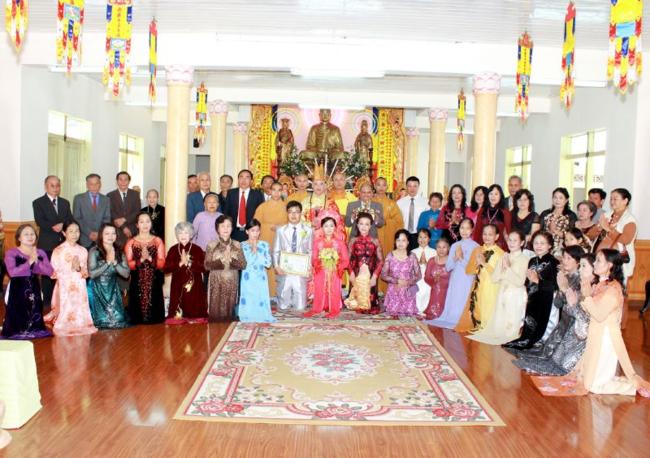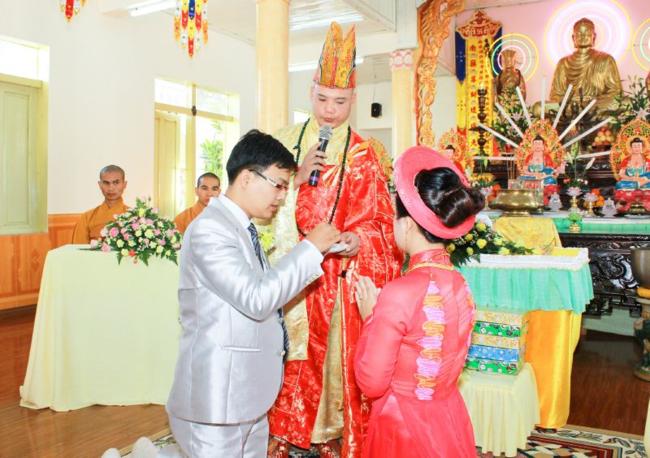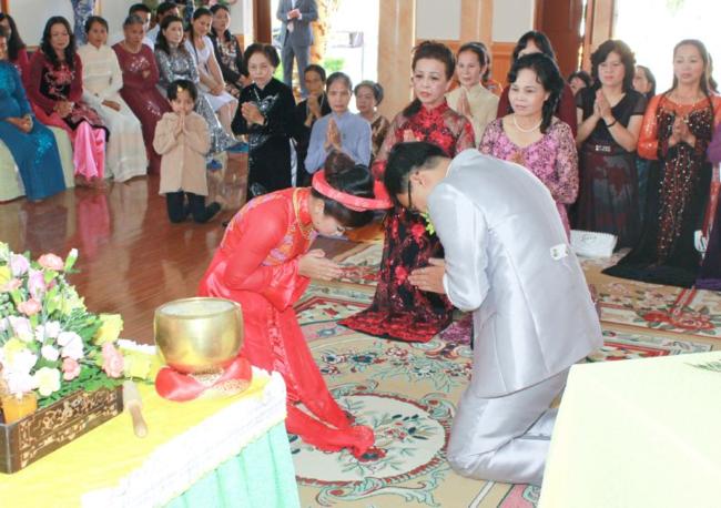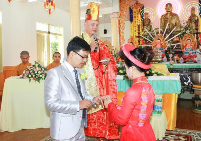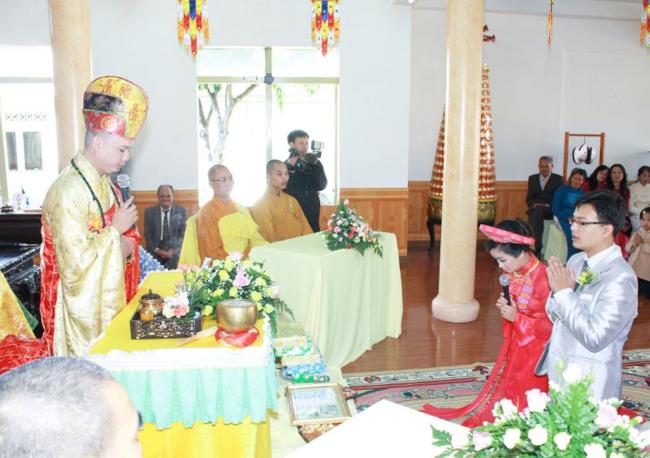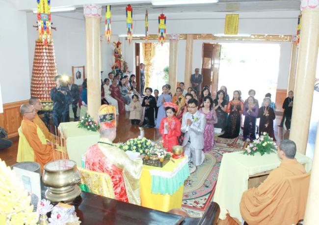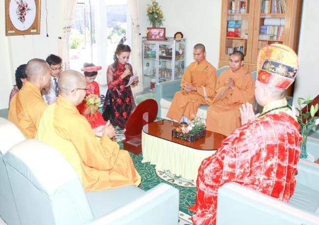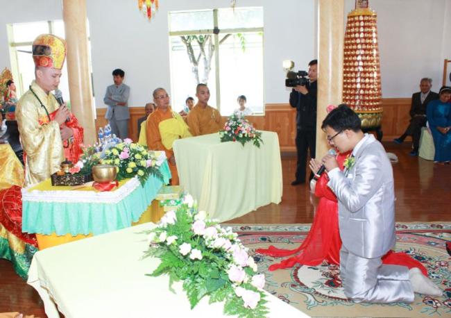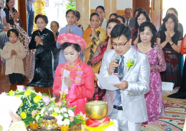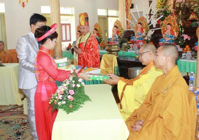 Những nghi thức truyền thống của Phật giáo được thực hiện một cách trang nghiêm trước sự chứng minh của chư Tôn đức, thông gia hai họ và gần một trăm quan khách tham dự. Tân lang Ngọc Dương đã phát tâm quy y Tam bảo và nguyện lãnh giữ những nguyên tắc đạo đức nhà Phật.