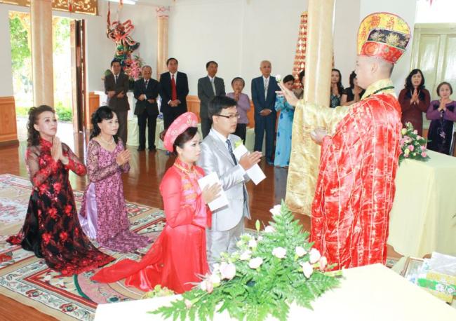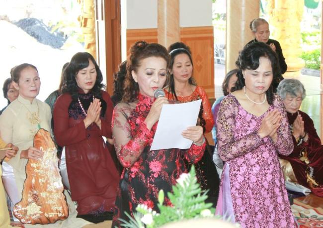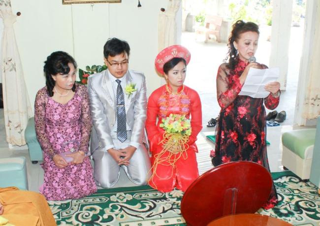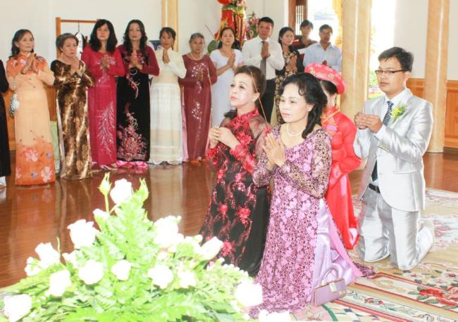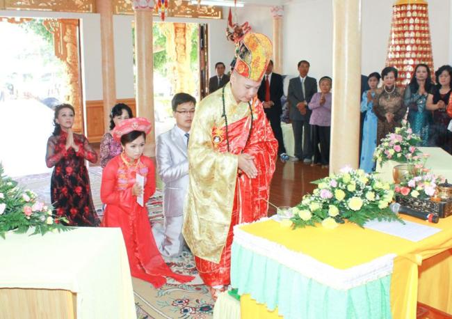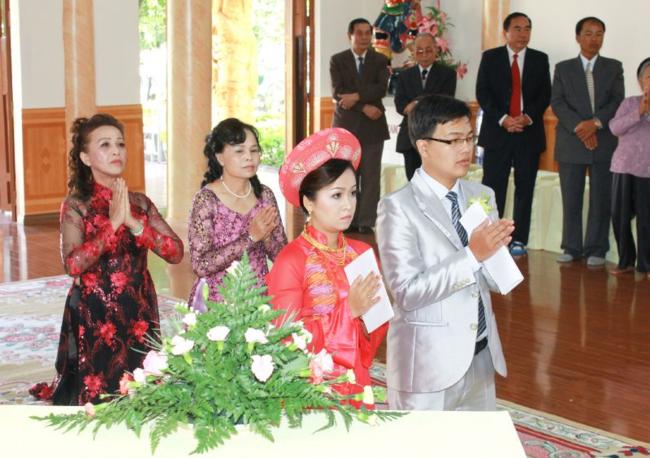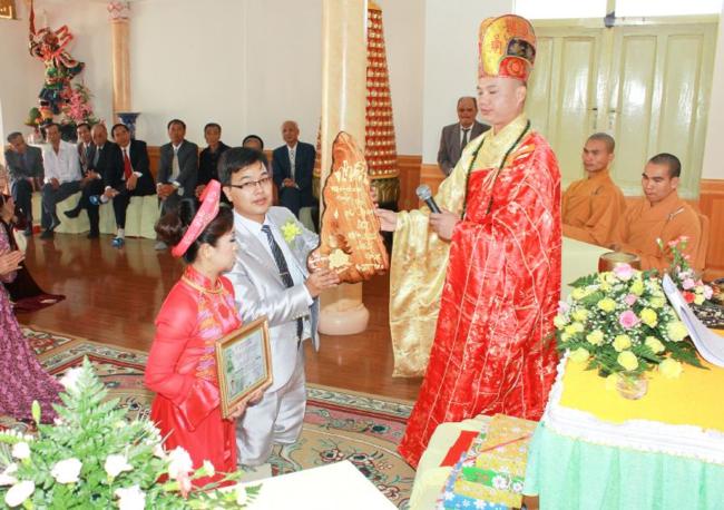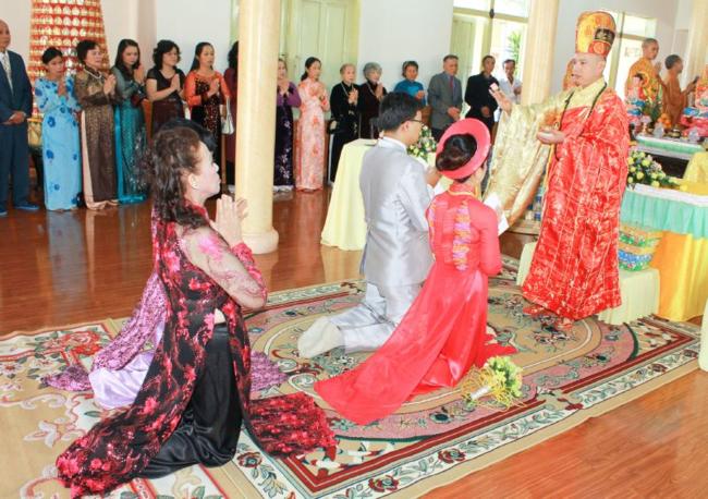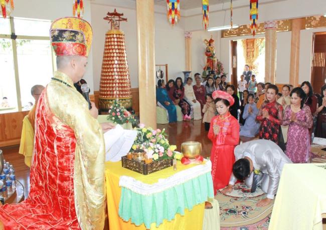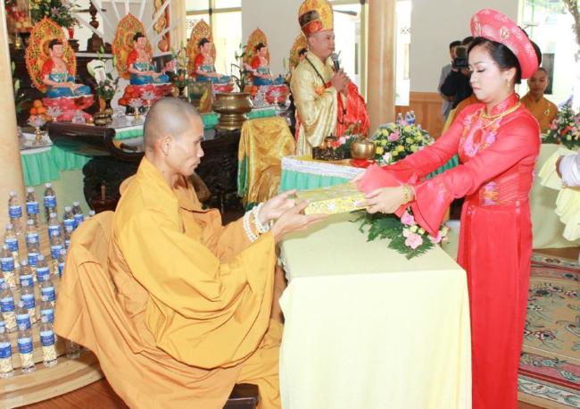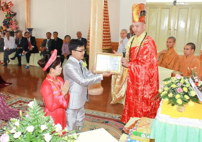 Những nghi thức truyền thống của Phật giáo được thực hiện một cách trang nghiêm trước sự chứng minh của chư Tôn đức, thông gia hai họ và gần một trăm quan khách tham dự. Tân lang Ngọc Dương đã phát tâm quy y Tam bảo và nguyện lãnh giữ những nguyên tắc đạo đức nhà Phật.
