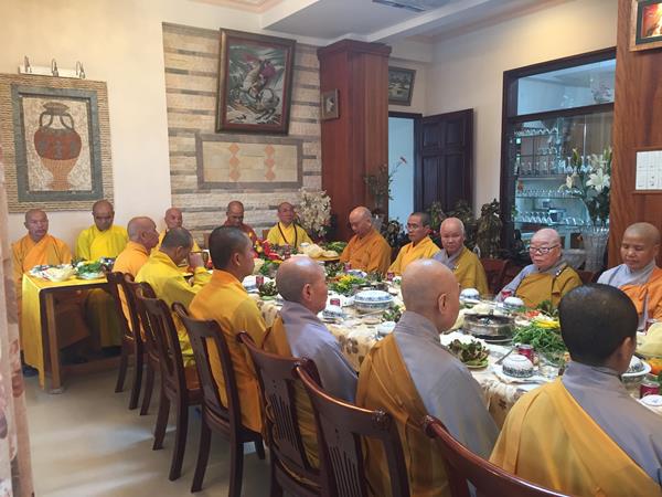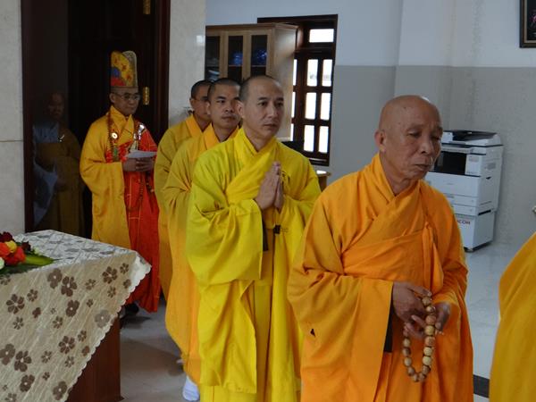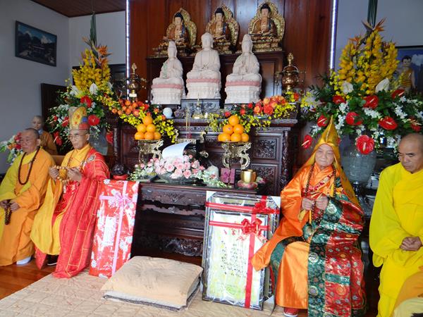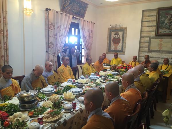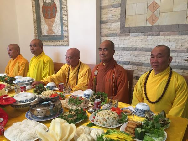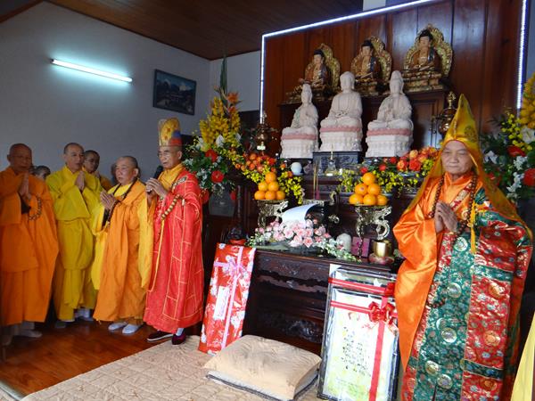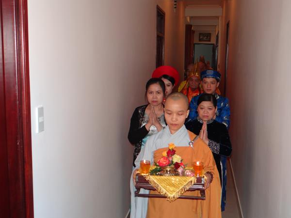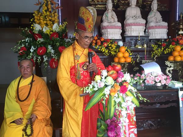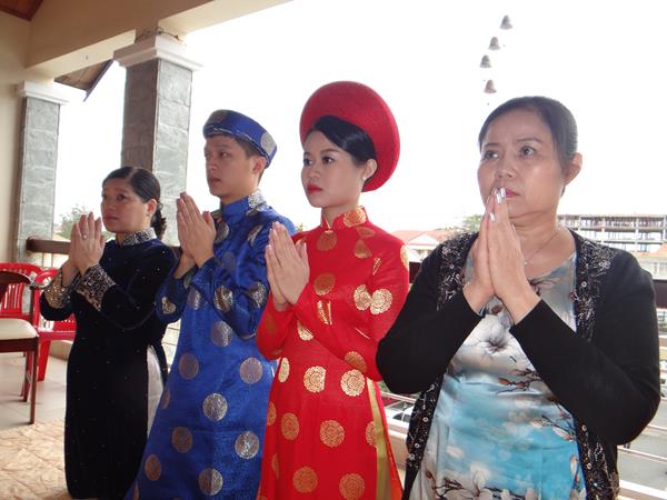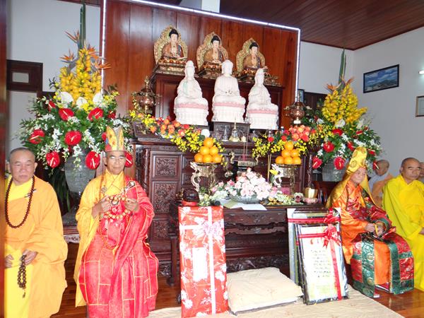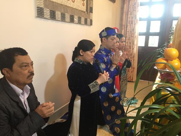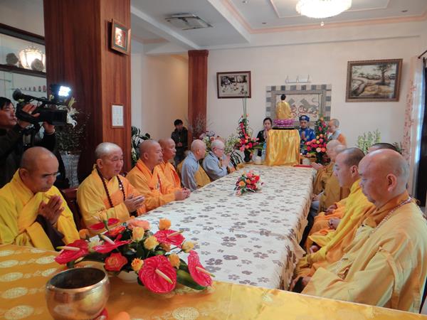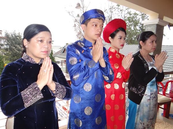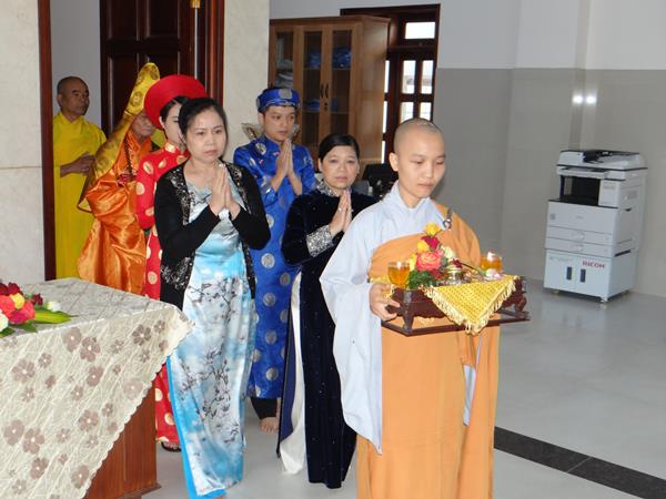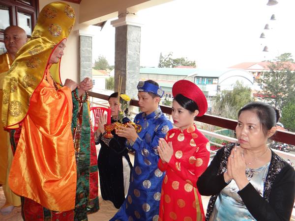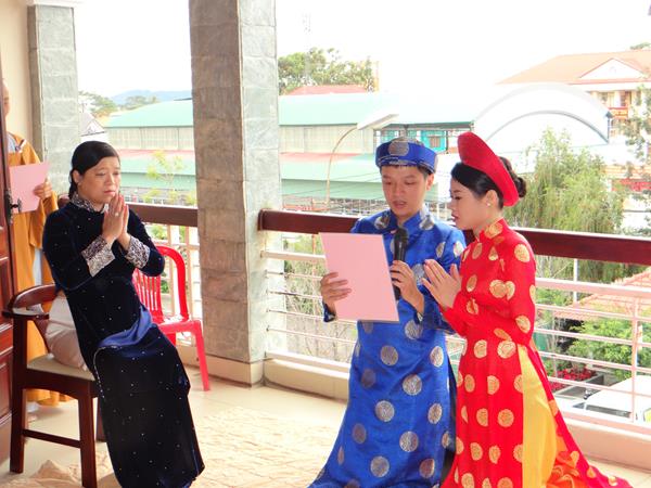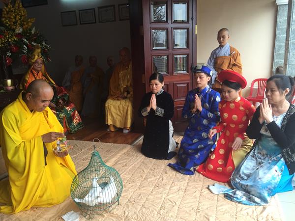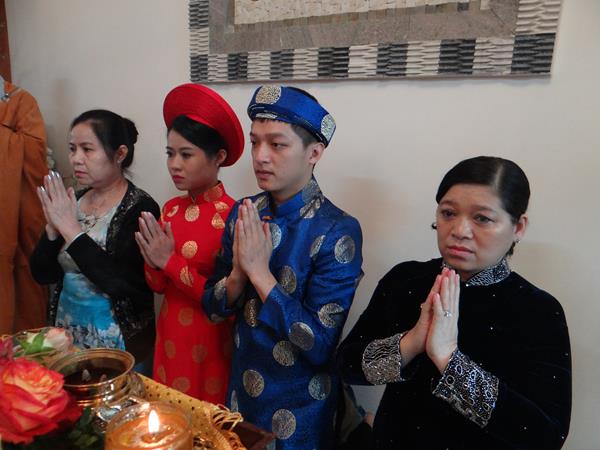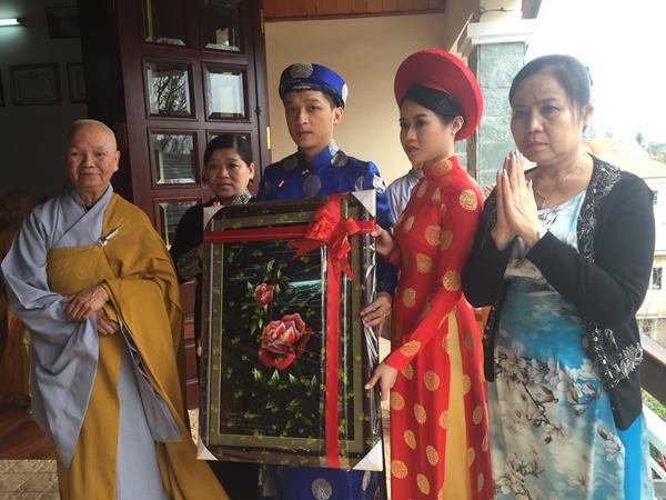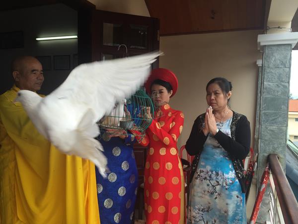 Cũng nhân dịp này, quan viên hai họ đã thành tâm thiết lễ cúng dường trai tăng, phóng sanh cầu nguyện đất nước thanh bình, Phật sự tăng huy,chúng sanh an lạc, Cửu huyền Thất tổ, nội ngoại gia tiên được siêu sanh lạc quốc . Chú rễ , phật tử Lê Khánh ( PD : Quảng Lượng) dâng lời tác bạch “ chúng con là hàng Phật tử tại gia, được may mắn thấm nhuần ơn Phật pháp và cảm ngộ ân giáo hóa của chư tôn đức tăng, ni nên chúng con mới rõ được sự nhiệm mầu, lợi ích của ba ngôi báu cũng như ân nghĩa sanh thành dưỡng dục bao la như trời biển của cha mẹ; khó bề báo đáp trong muôn một . Để làm tròn bổn phận “ nối dõi tông đường’, vâng cha mẹ đôi bên, hôm nay chúng con đã kết tóc se tơ, nên duyên chồng vợ . Chúng con thành tâm phát nguyện : Trọn đời chung sống bên nhau, một vợ một chồng, trọn lòng chung thủy và y theo lời Phật dạy trong kinh Thiện Sanh làm tròn bổn phận của người phật tử tại gia trong ngôi nhà chánh pháp …”