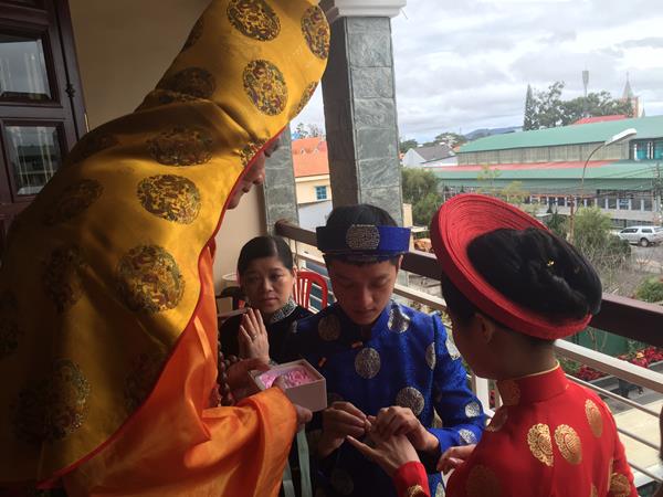 Trong không khí trang nghiêm, hoan hỷ, thanh tịnh dưới sự chứng minh của chư tôn đức và quan viên hai họ, đôi tân lang, tân nương đã trao nhẫn cưới cho nhau . Hòa thượng ân cần chỉ dạy : “ “ bách nhẫn thành kim” trăm điều nhẫn sẽ mang lại nhiều điều lành tốt đẹp quí hơn vàng , từ đó gia đình sẽ mãi mãi hạnh phúc, an vui … xây dựng một xã hội phồn vinh, tốt đẹp vì mỗi gia đình là một tế bào của xã hội .