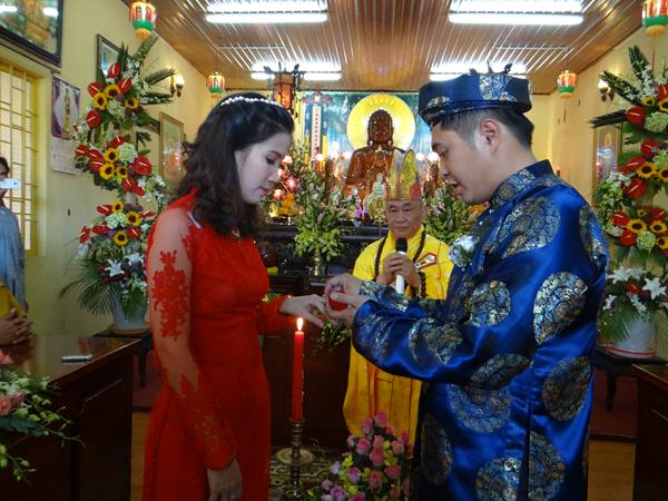 Trong không khí trang nghiêm, hoan hỷ, thanh tịnh dưới sự chứng minh của chư tôn đức và quan viên hai họ, đôi tân lang, tân nương đã trao nhẫn cưới cho nhau . Thượng tọa ân cần chỉ dạy :“ bách nhẫn thành kim” trăm điều nhẫn sẽ mang lại nhiều điều lành tốt đẹp quí hơn vàng , từ đó gia đình sẽ mãi mãi hạnh phúc, an vui … xây dựng một xã hội phồn vinh, tốt đẹp vì mỗi gia đình là một tế bào của xã hội …