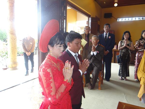 Đồng thời, đôi tân lang, tân nương cũng phải biết giữ đạo làm con, làm cháu, biết quan tâm, chăm sóc, phụng dưỡng cho cha mẹ, ông bà nội ngoại lúc tuổi già, không nên chỉ lo xây dựng tổ ấm của mình mà quên đi trách nhiệm, bổn phận với tổ tiên, dòng họ. Trong không khí trang nghiêm, hoan hỷ, thanh tịnh chư tôn đức và quan viên hai họ, đôi tân lang, tân nương sau khi đã đảnh lễ tứ thân phụ mẫu, đôi vợ chồng trẻ đã trao nhẫn cưới cho nhau. Thượng tọa ân cần chỉ dạy: “bách nhẫn thành kim” trăm điều nhẫn sẽ mang lại nhiều điều lành tốt đẹp quí hơn vàng, từ đó gia đình sẽ mãi mãi hạnh phúc, an vui… xây dựng một xã hội phồn vinh, tốt đẹp vì mỗi gia đình là một tế bào của xã hội…