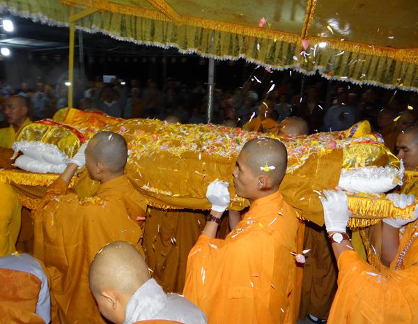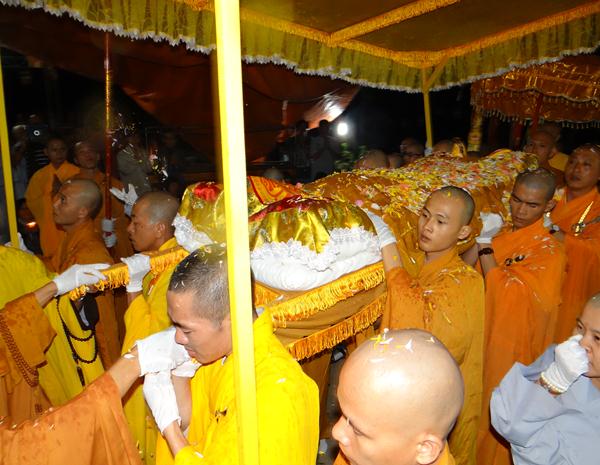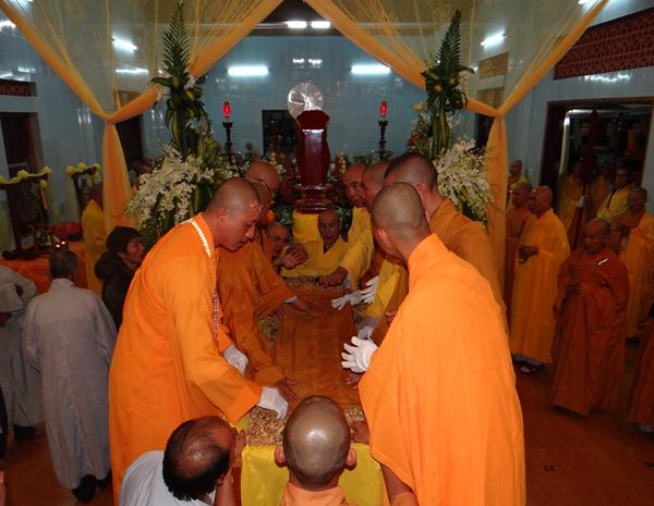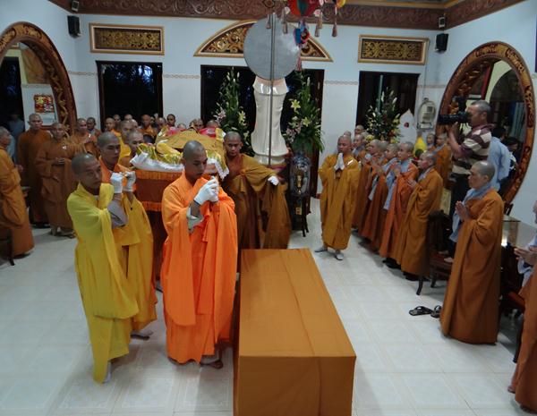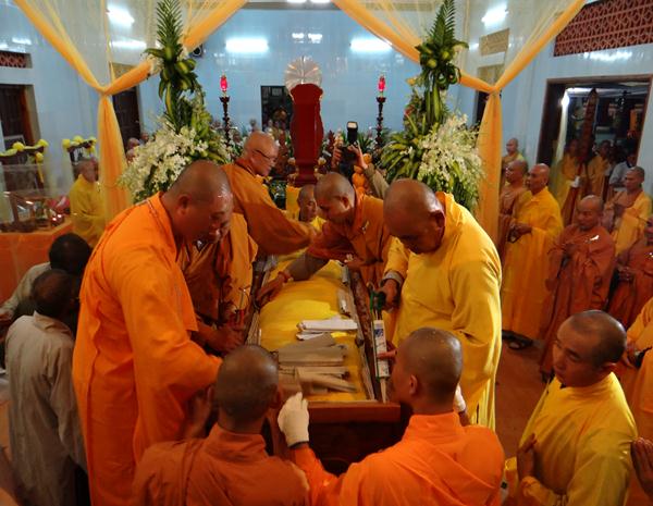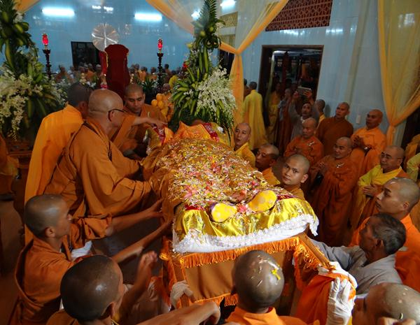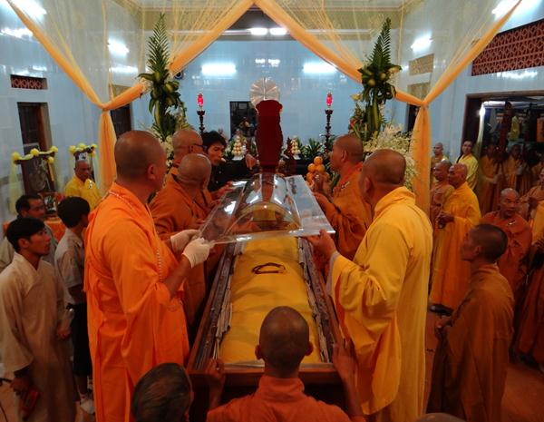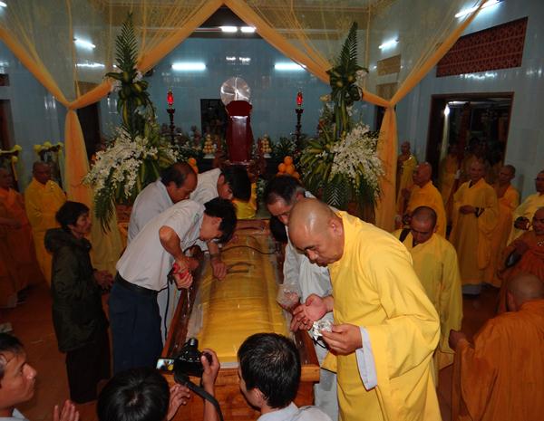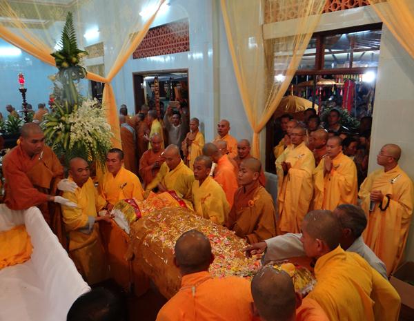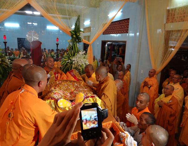 Sau lễ tác bạch thỉnh sư, chư tôn đức đã cử hành lễ sái tịnh kim quan, cung thỉnh nhục thân Hòa thượng nhập kim quan trong tiếng niệm Phật trầm hùng và chuông trống Bát-nhã liên hồi chuyển.