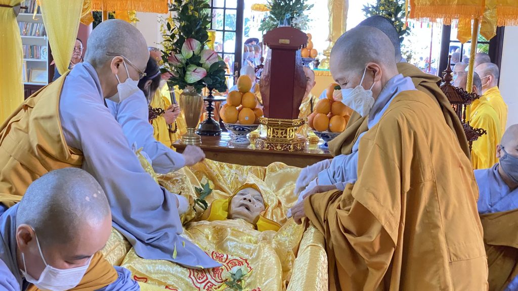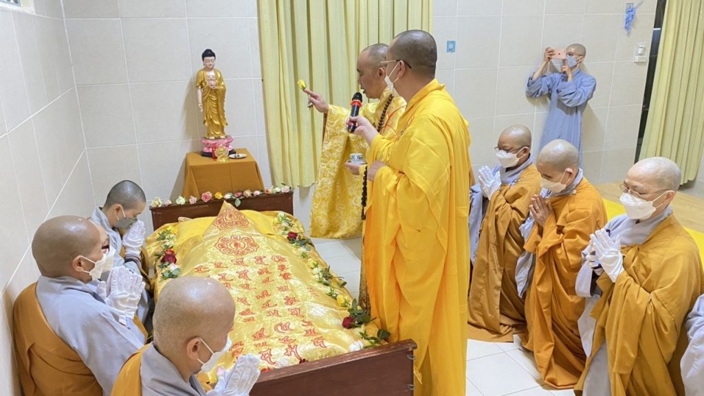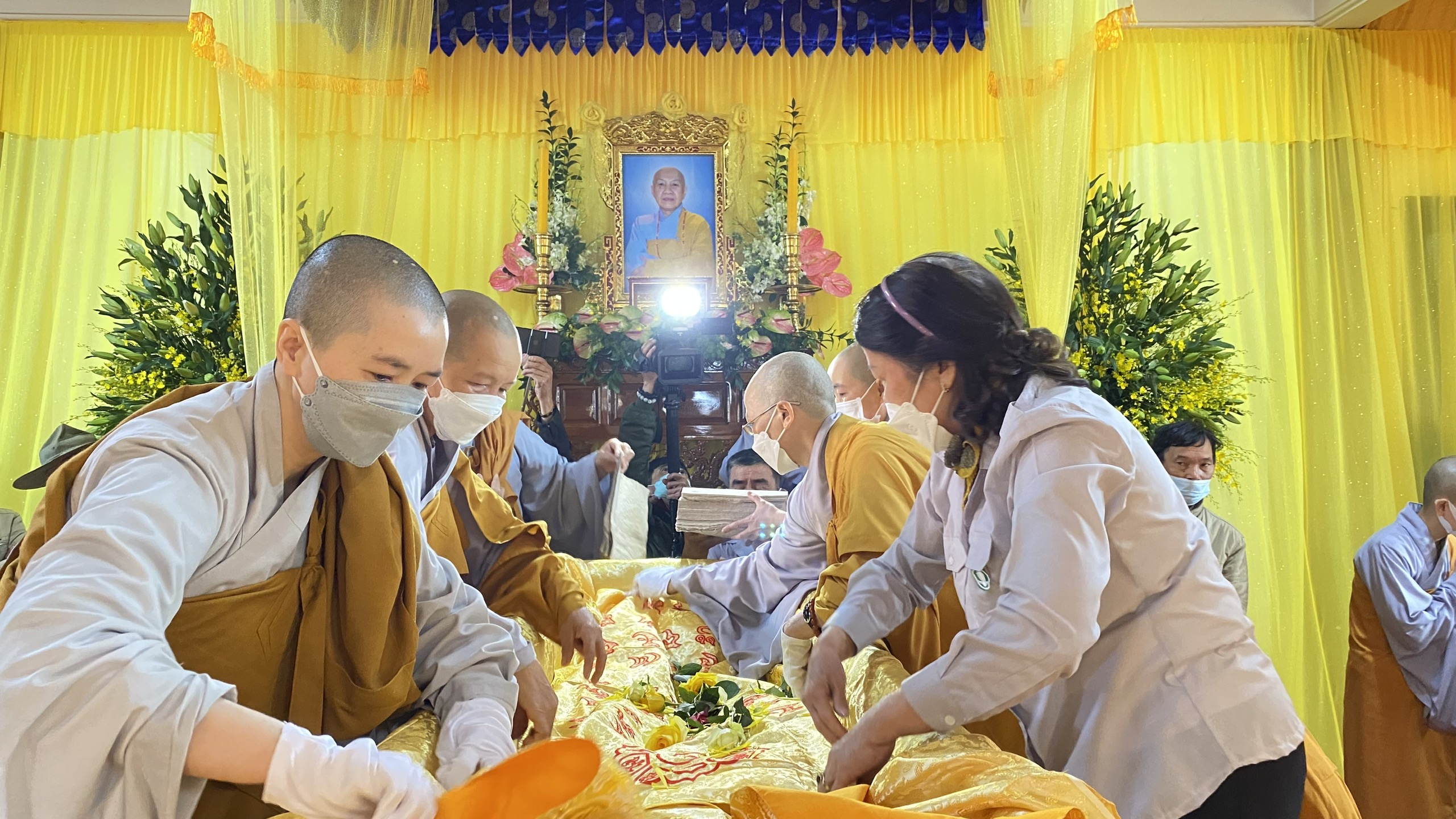 Trước Phật tiền Chư Tôn Đức đã niêm hương cầu nguyện, đồng trì tụng Pháp bảo Tôn kinh, cung thỉnh nhị vị Hòa thượng chứng minh sái tịnh kim quan. Trong tiếng niệm Phật trang nghiêm, thanh tịnh và chuông trống Bát Nhã liên hồi, môn đồ pháp quyến đã cung thỉnh nhục thân Ni trưởng rời thiền thất đến Giác linh đường, nơi tôn trí kim quan để làm lễ nhập quan.