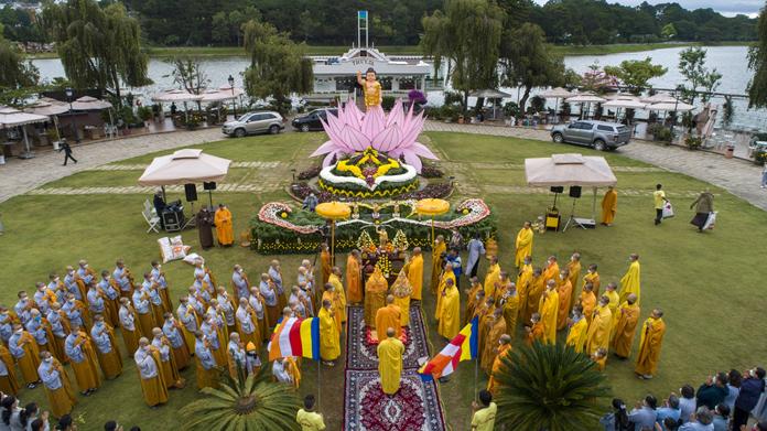 Trong không khí trang nghiêm, thanh tịnh hòa quyện với tấm lòng thành kính của hàng trăm người con Phật ở thành phố hoa thơ mộng hướng về ngày đức Phật đản sanh.  Sáng nay, mùng 8 tháng Tư năm Nhâm Dần (08/05/2022) Ban Trị Sự GHPGVN thành phố Đà Lạt đã trang nghiêm cử hành lễ rước bảo tượng đức Phật đản sanh từ Tổ đình Linh Quang ( ngôi chùa đầu tiên , khơi nguồn đạo Phật tại phố núi cao nguyên), đến tôn trí tại lễ đài công viên Thủy Tạ bên bờ Hồ Xuân Hương, trung tâm TP Đà Lạt , mở đầu cho tuần lễ kính mừng Phật đản tại xứ sở hoa anh đào .