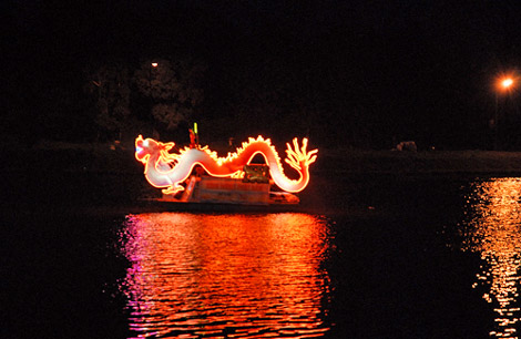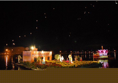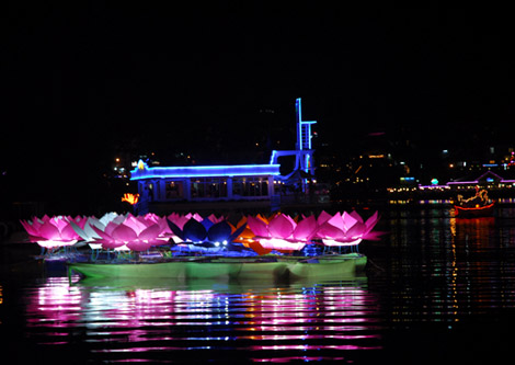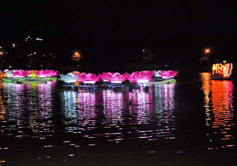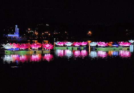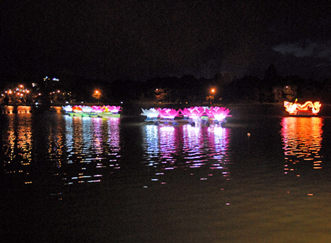 Và kia những mái chèo lướt nhẹ, khua động sự yên tĩnh trên mặt hồ soi bóng những hàng thẳng tắp, thắp sáng những ngọn nến lung linh mờ ảo. Trăng thanh , gió mát hoà quyện với nét đẹp trầm lắng của phố ngàn hoa đã tạo nên một không gian huyền ảo, thiêng liêng và giải thoát .