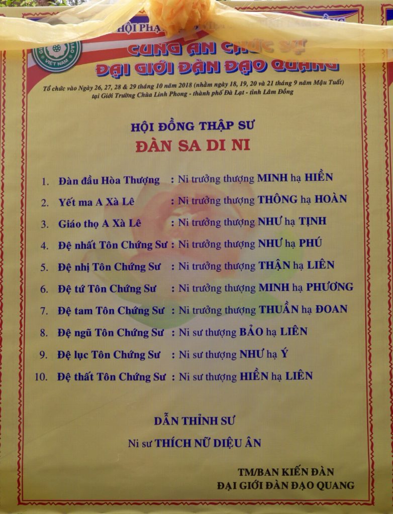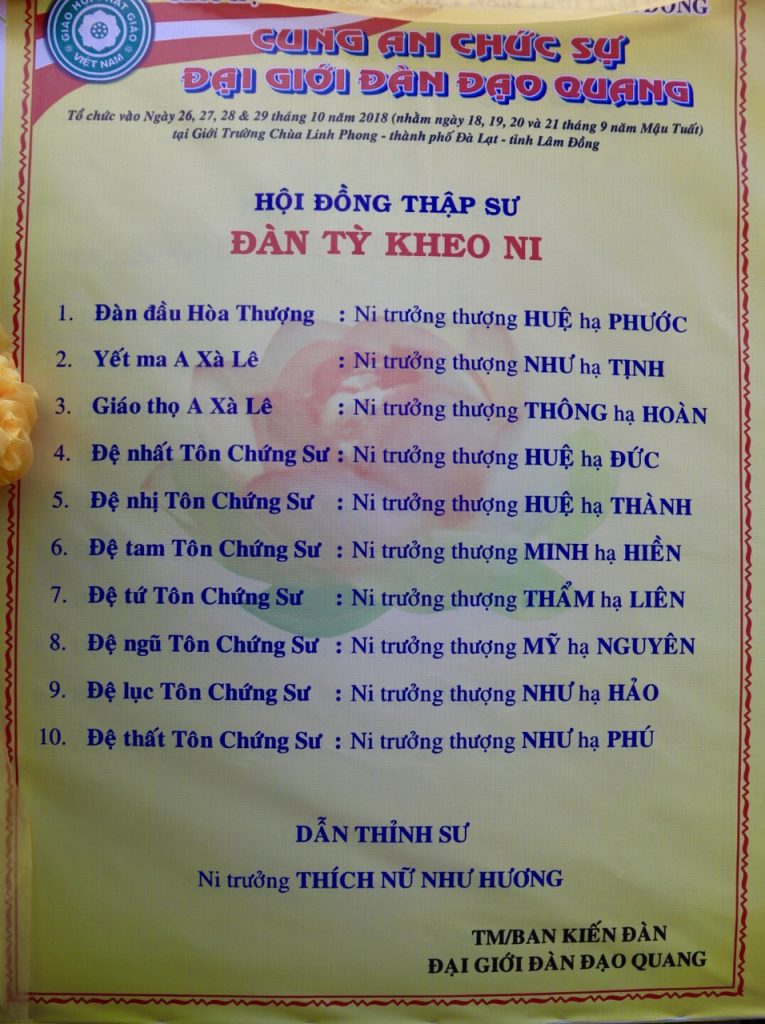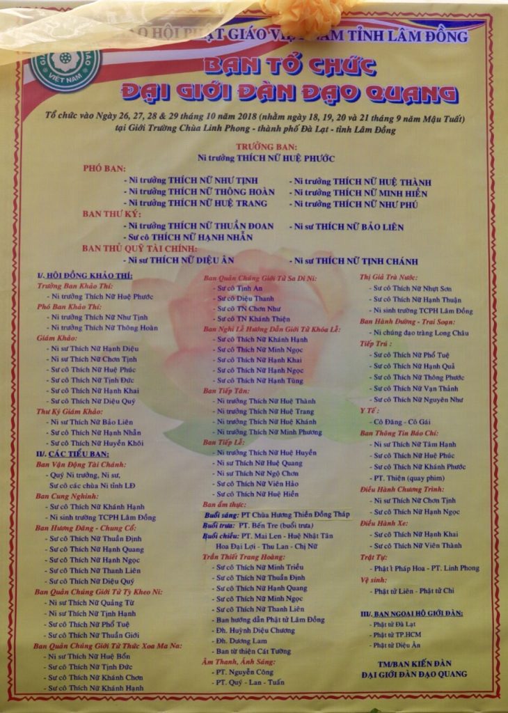 Được biết, Đại giới đàn đã cung thỉnh HT. Thích Toàn Đức, UV. HĐTS – Trưởng BTS GHPGVN tỉnh Lâm Đồng, đương vi Trưởng ban tổ chức , Chánh chủ Đàn Tăng , Ni trưởng Thích Nữ Huệ Phước, Chánh chủ Đàn Ni .