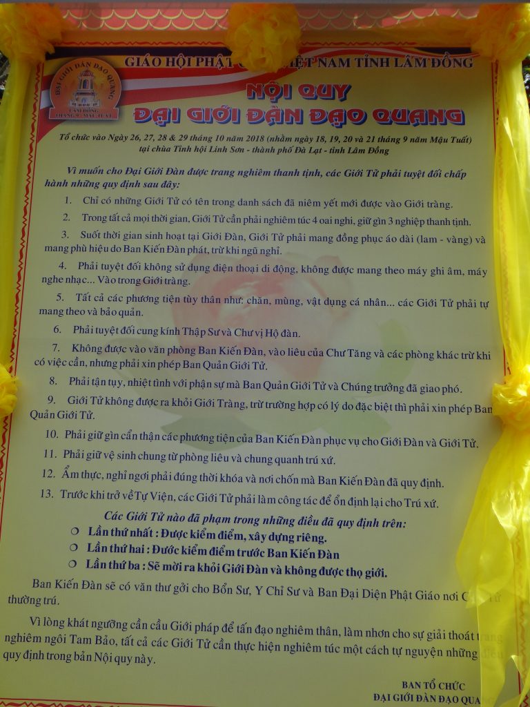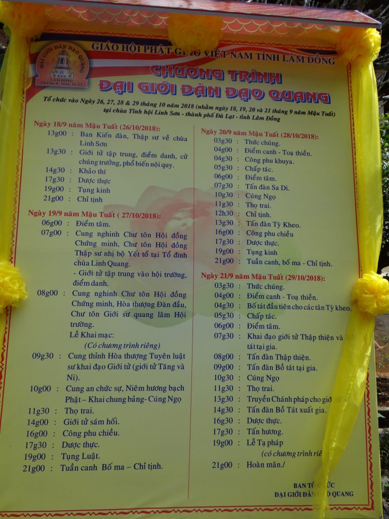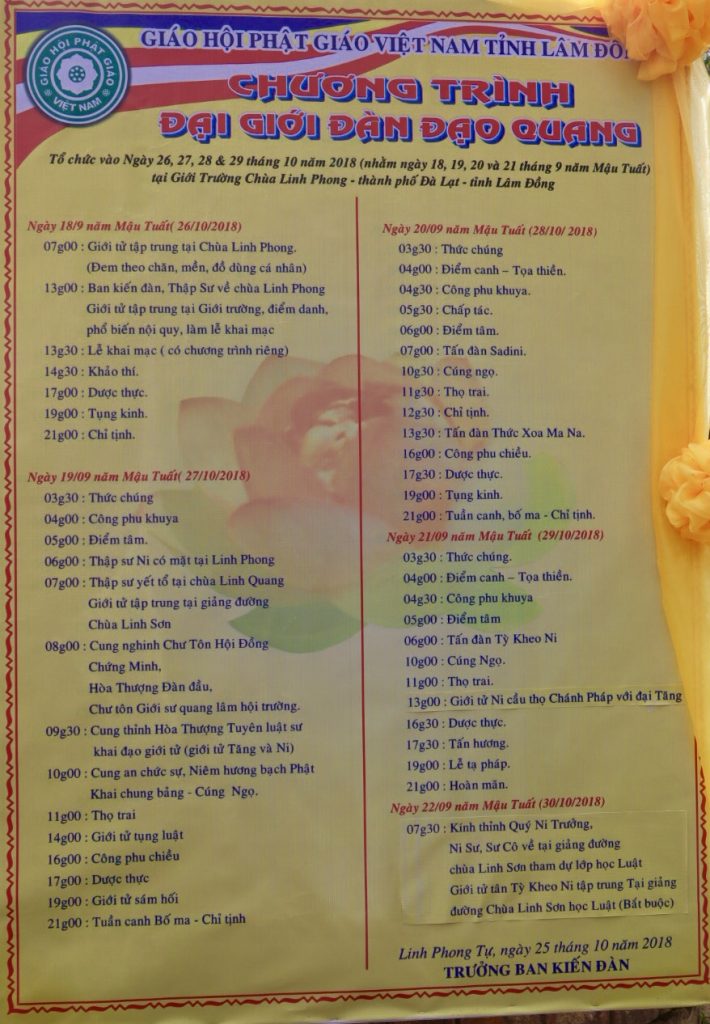 Sáng nay, ngày 25/10/2018 ( nhằm ngày 17/9/Mậu Tuất), TT. Thích Thanh Nhật, Phó ban kiêm Chánh thư ký BTS GHPGVN tỉnh Lâm Đồng cho biết : “ Đại giới Đàn Đạo Quang  sẽ được BTS Phật giáo tỉnh nhà long trọng tổ chức từ ngày 26,27,28,29 tháng 10 năm 2018 ( nhằm ngày 18,19,20,21/9/Mậu Tuất) tại chùa tỉnh hội Linh Sơn ( kiến đàn Tăng ) và chùa Sư Nữ Linh Phong ( kiến đàn Ni ) TP Đà Lạt .
