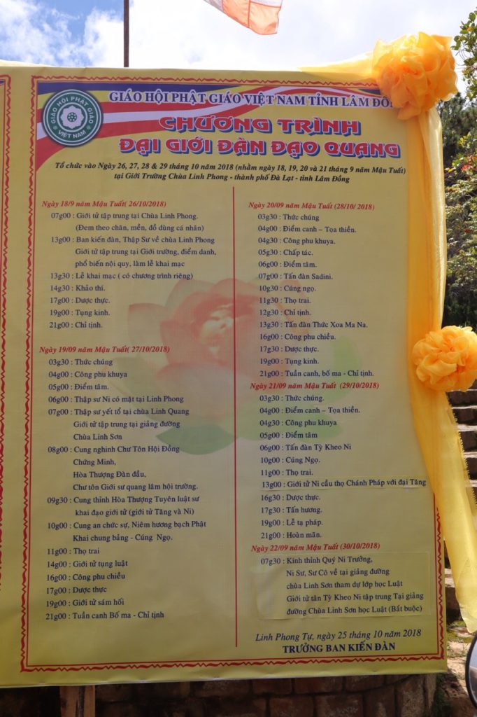 Theo thông báo của Ban tổ chức kiến đàn, giới tử nhập giới trường vào lúc 6 giờ 00 ngày 26/10/2018 ( nhằm ngày 18/9/Mậu Tuất).  Trong đó giới tử Tăng tập trung tại chùa Linh Sơn ( 120 Nguyễn Văn Trỗi – Phường II -TP Đà Lạt ) và giới tử Ni tập trung tại chùa Linh Phong ( Đường Hoàng Hoa Thám – Phường 10 – TP Đà Lạt ) .