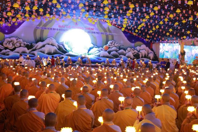 Trong giai điệu sâu lắng của các nhạc phẩm Phật giáo như “Ngọn nến nguyện cầu”, “Ơn Đức Tổ Ni”, chư Ni đã trang nghiêm tiến lên lễ đài dâng nến, trong khi quý Ni trưởng thực hiện nghi thức truyền đăng, lan tỏa ánh sáng đến khắp đạo tràng.