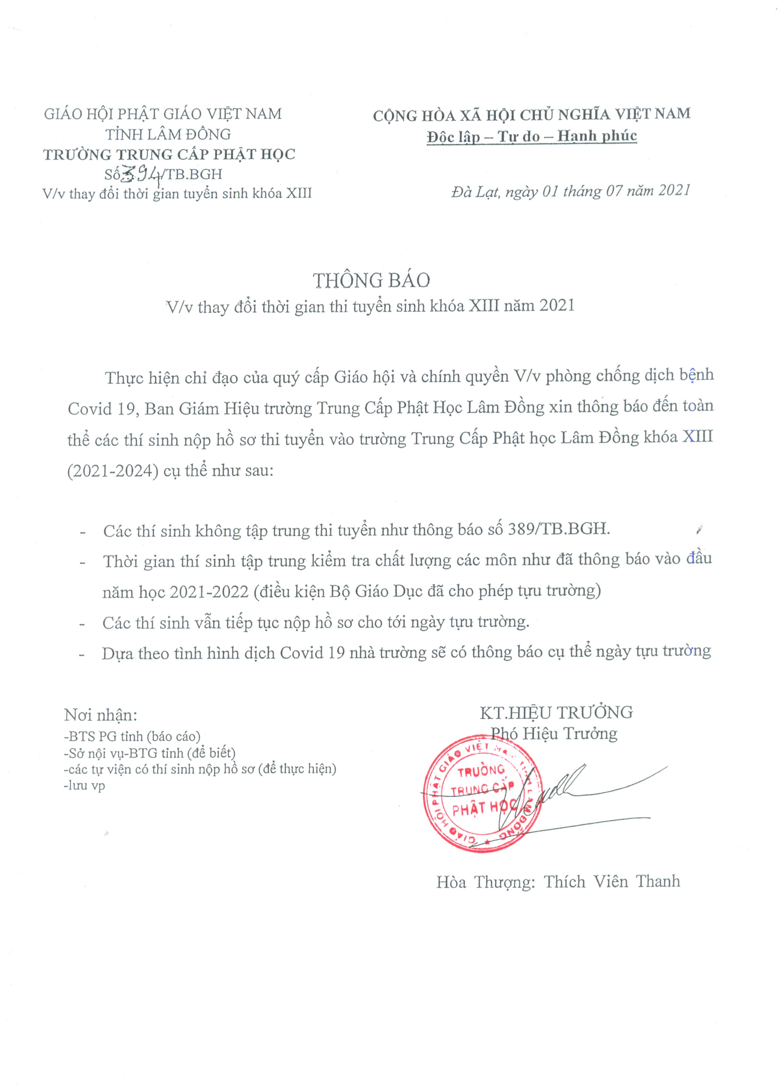 Thực hiện chỉ đạo của quý cấp Giáo hội và chính quyền địa phương về việc phòng chống dịch bệnh Covid-19, Ban giám hiệu trường Trung cấp Phật học tỉnh Lâm Đồng đã có thông báo số 394/TB.BGH ngày 01/07/2021 Về việc thay đổi thời gian thi tuyển sinh khóa XIII năm 2021.
