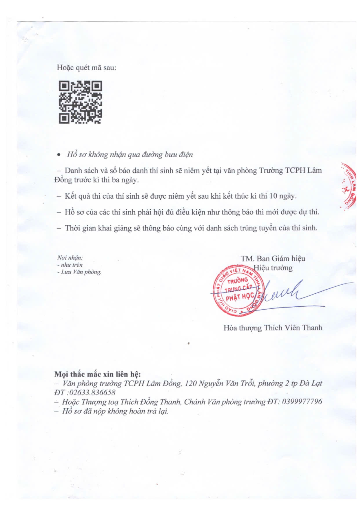– Tất cả hồ sơ của thí sinh dự thi gửi về : Văn phòng Trường Trung cấp Phật học Lâm Đồng, 120 Nguyễn Văn Trỗi,phường 2 tp Đà Lạt