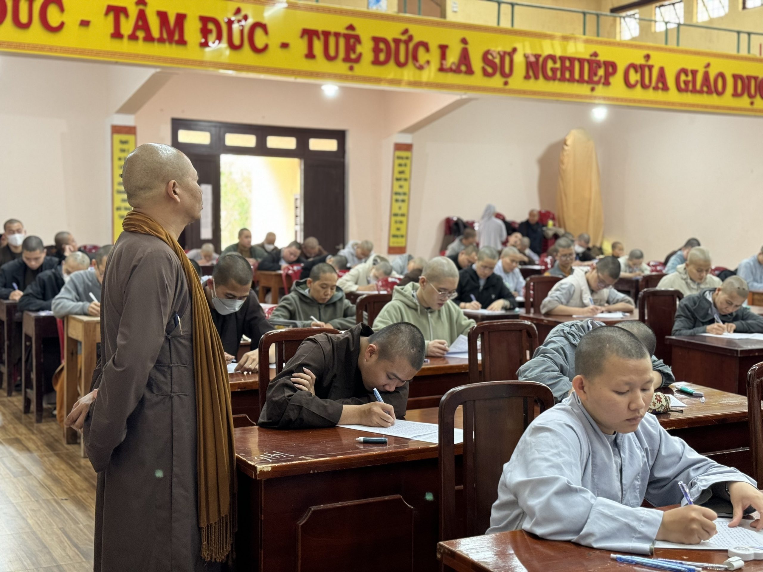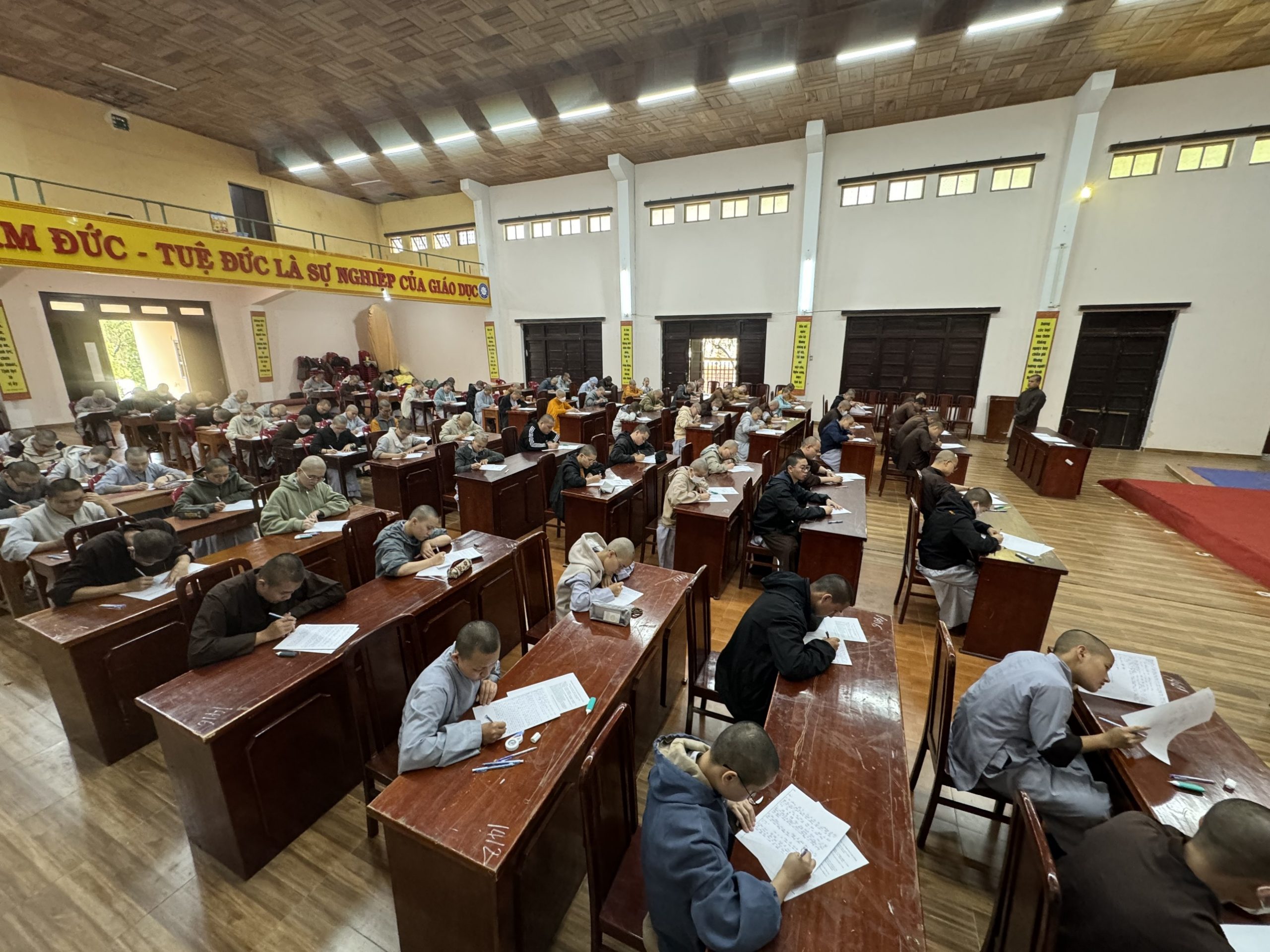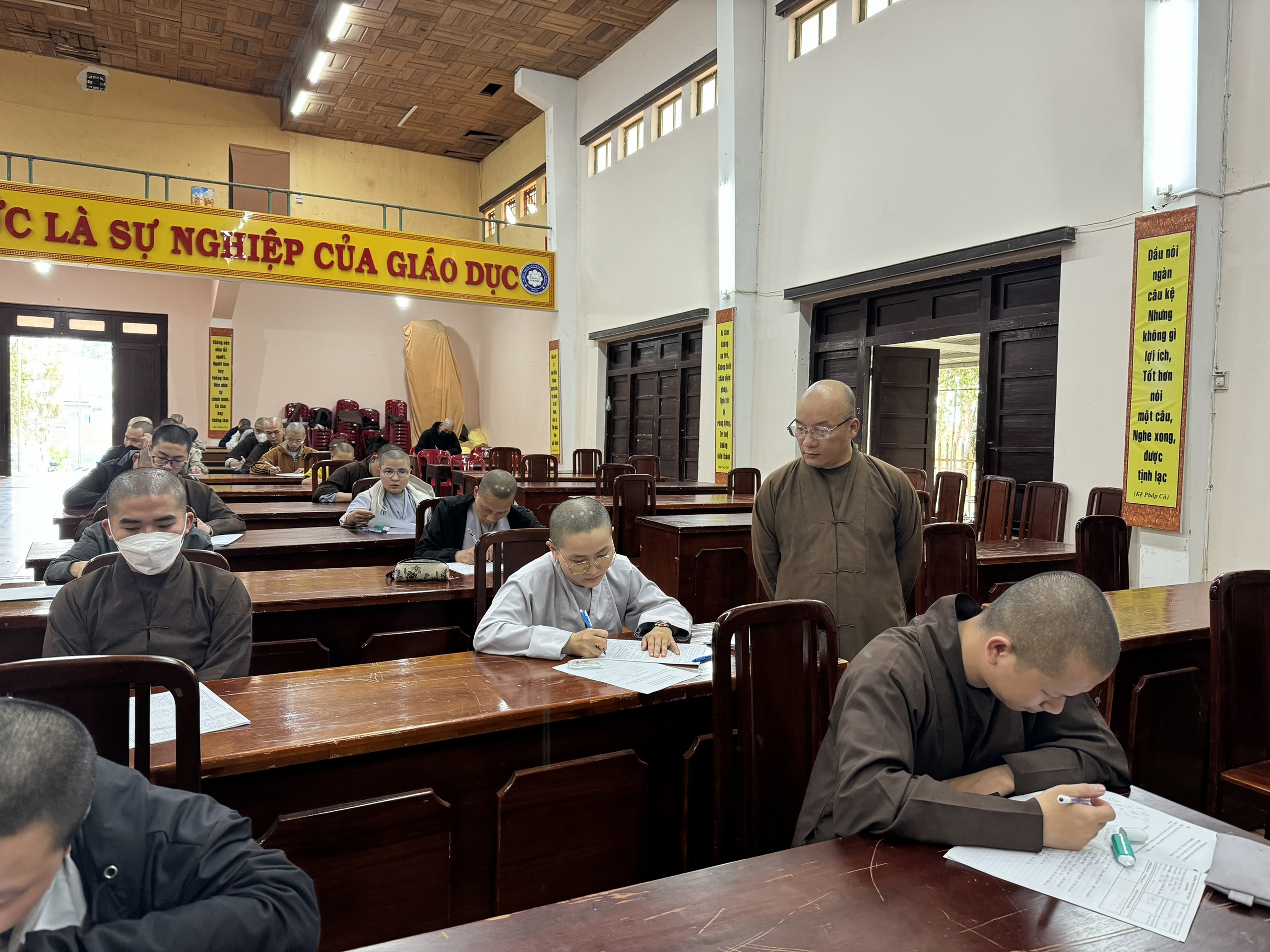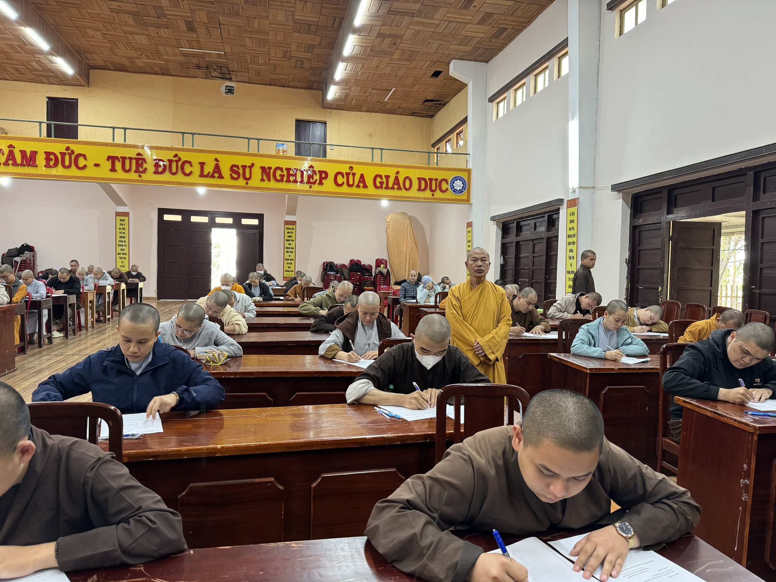 Hòa thượng Hiệu trưởng Thích Viên Thanh đã phát biểu chỉ đạo mọi công việc tổ chức thi diễn ra nghiêm túc và đúng với các quy định trong thi cử. Đây là một công việc thường xuyên được tổ chức sau mỗi học kì nhằm đánh giá và kiểm tra kiến thức, năng lực của Tăng ni sinh trong thời gian tham gia học tại trường. Các Tăng ni sinh phải hoàn thanh những kiến thức cơ bản của hệ trung cấp và cao đẳng do nhà trường giảng dạy.
