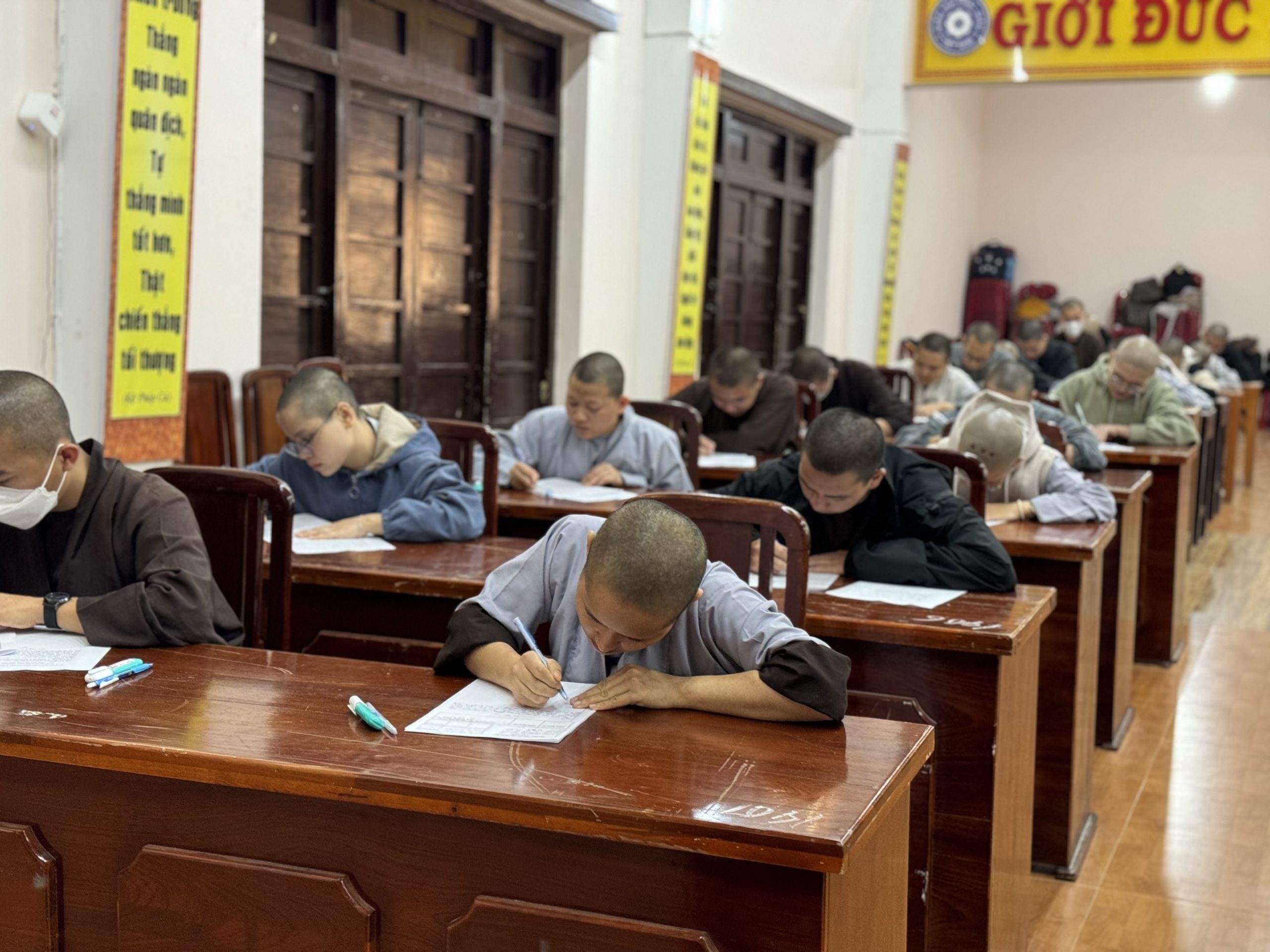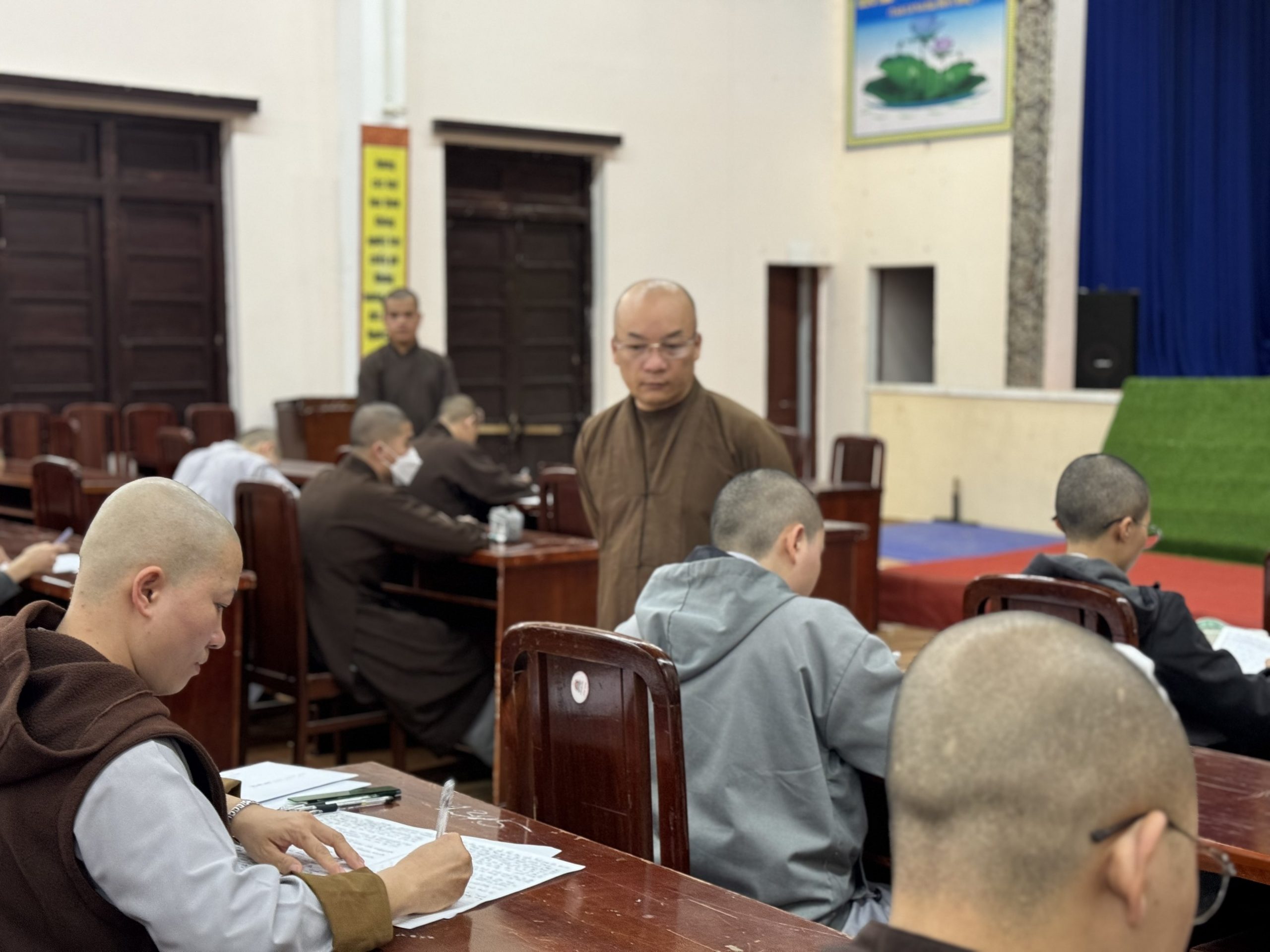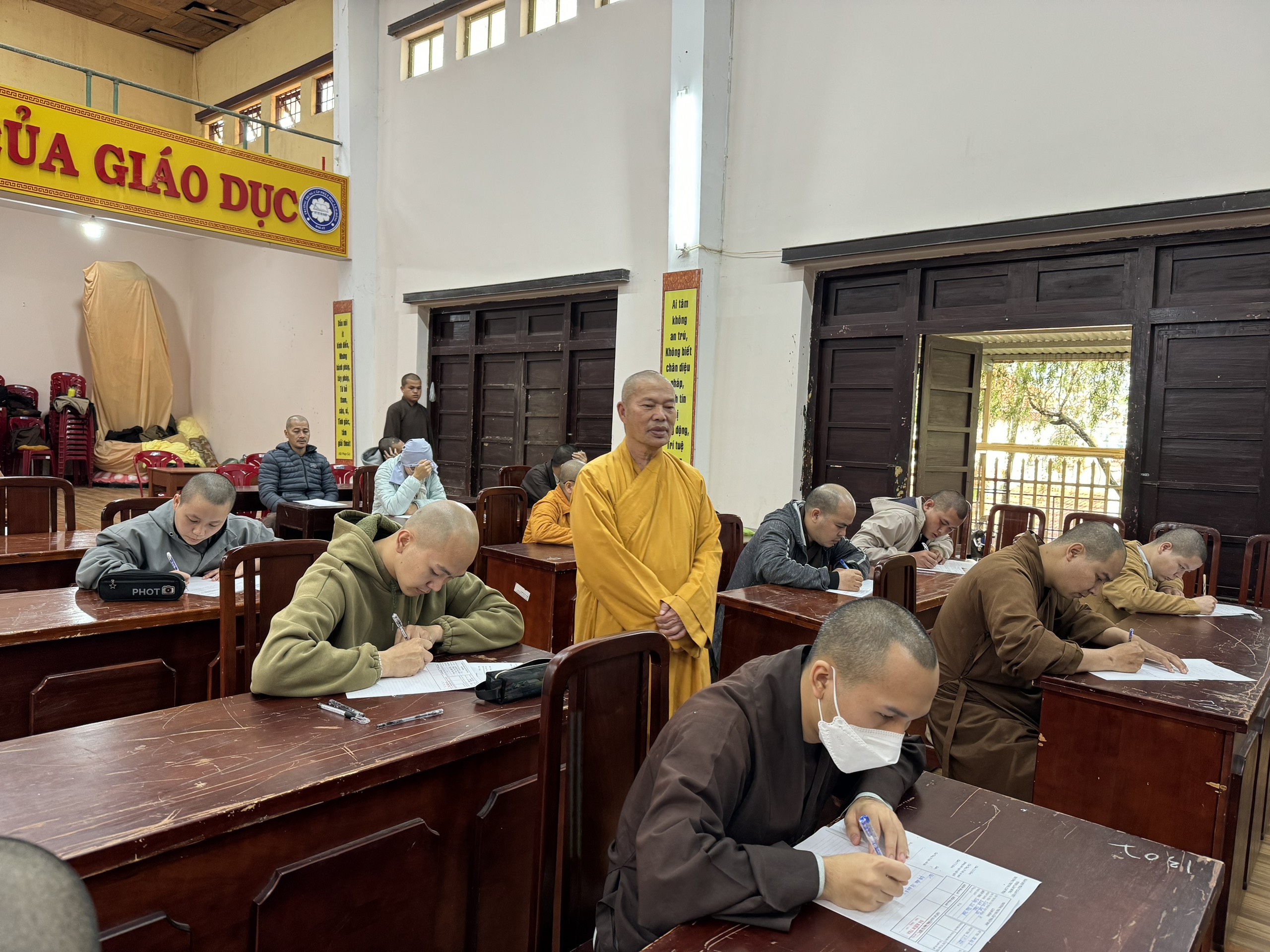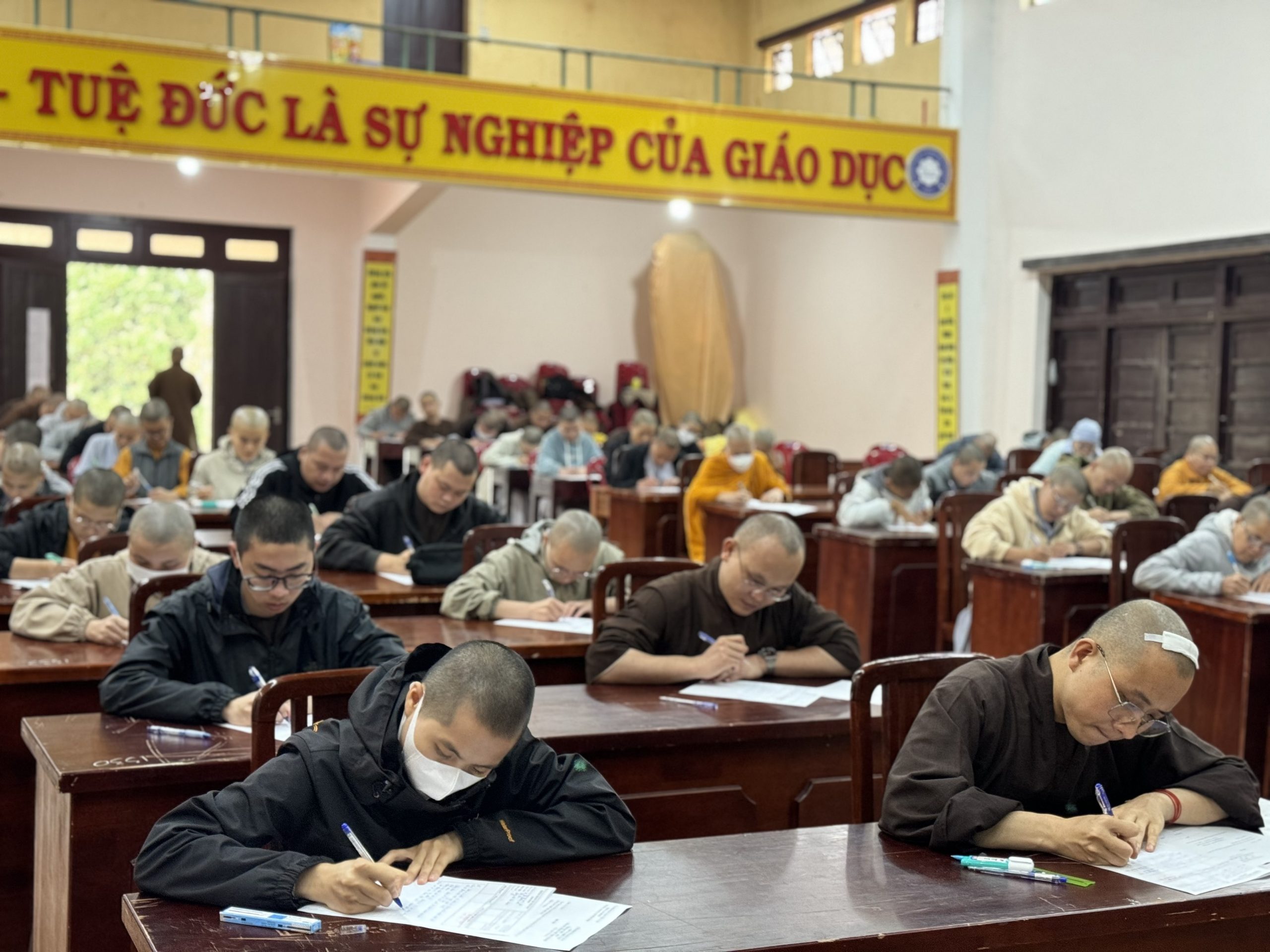 Hòa thượng Hiệu trưởng Thích Viên Thanh đã phát biểu chỉ đạo mọi công việc tổ chức thi diễn ra nghiêm túc và đúng với các quy định trong thi cử. Đây là một công việc thường xuyên được tổ chức sau mỗi học kì nhằm đánh giá và kiểm tra kiến thức, năng lực của Tăng ni sinh trong thời gian tham gia học tại trường. Các Tăng ni sinh phải hoàn thanh những kiến thức cơ bản của hệ trung cấp và cao đẳng do nhà trường giảng dạy.