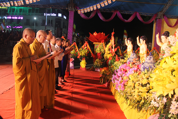 Sau nghi lễ dâng hương và mộc dục, toàn thể đại lễ đã thực hiện chương trình Hoa đăng chào mừng Đại lễ. Được biết trong Đại lễ Ban tổ chức và nhân dân Phật tử đã thả 5000 ngọn đèn hoa đăng xuống sông Kỳ Cùng để cầu nguyện cho thế giới hòa bình, nhân dân an lạc.