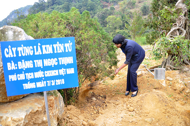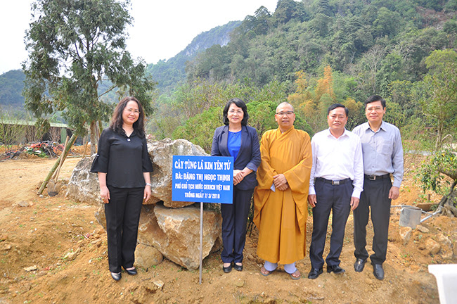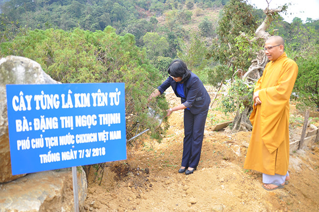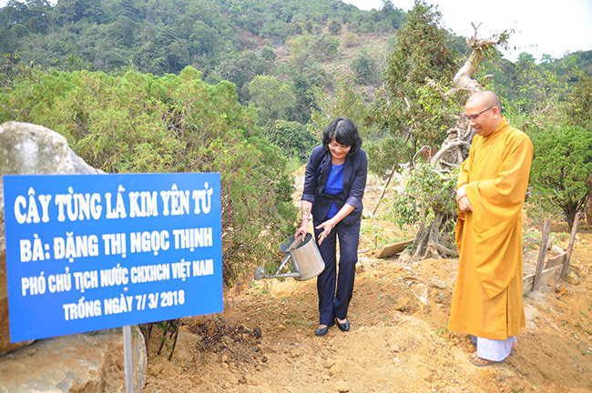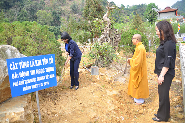 Sau đó Phó Chủ tịch nước Đặng Thị Ngọc Thịnh cùng phái đoàn đã dâng hương cúng Phật và trồng cây lưu niệm tại chùa Tân Thanh.