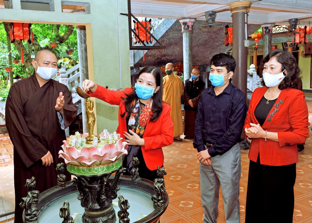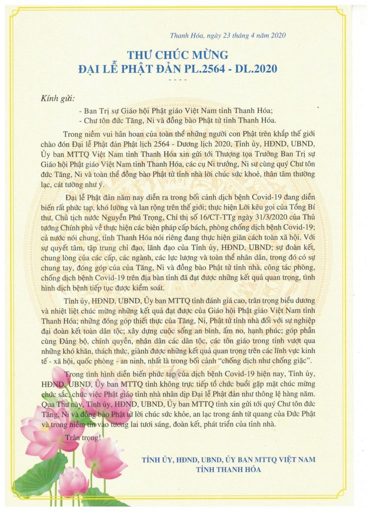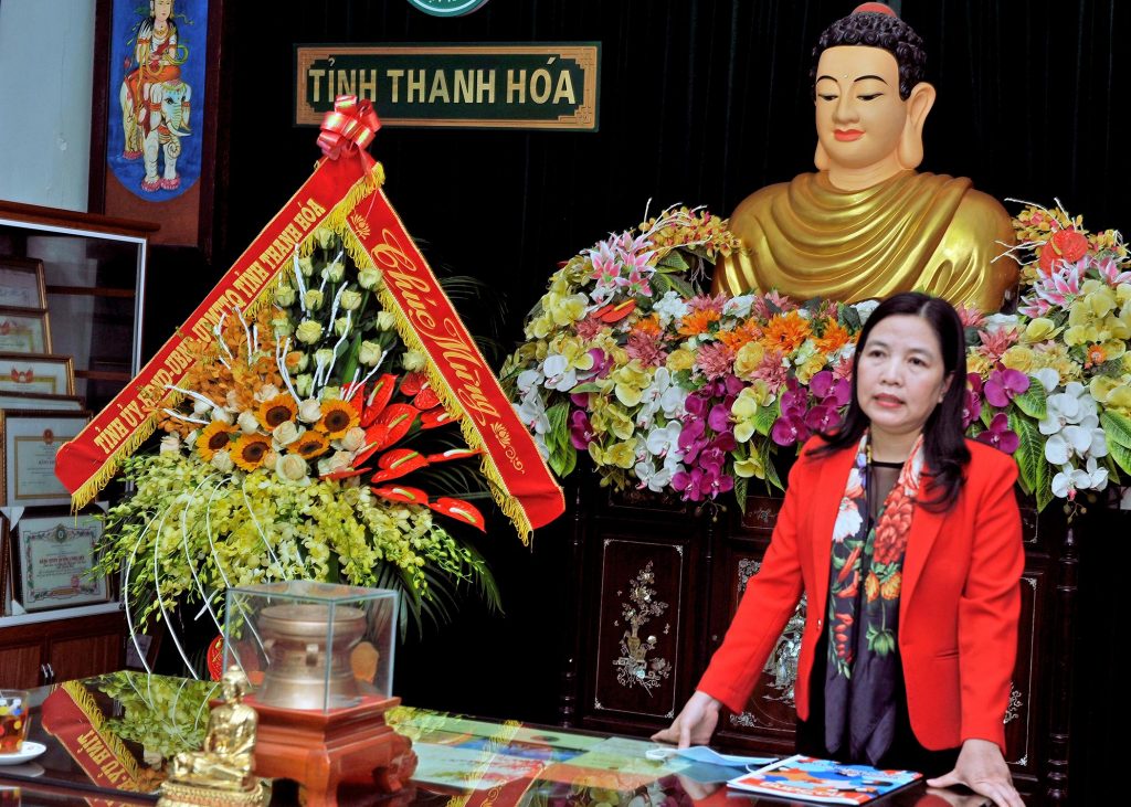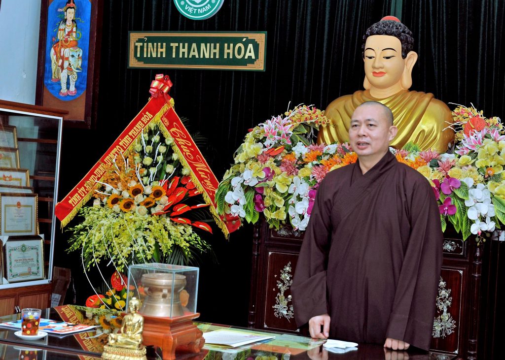 Thay mặt lãnh đạo tỉnh Bà Phạm Thị Thanh Thủy – Trưởng Ban Dân Vận , Chủ tịch UB MTTQ tỉnh gửi tới Thượng tọa Trưởng Ban Trị sự Giáo hội Phật giáo tỉnh, các cụ Ni trưởng, Ni sư cùng quý Chư tôn đức Tăng, Ni và toàn thể đồng bào Phật tử trong tỉnh lời chúc sức khỏe, thân tâm thường lạc, cát tường như ý; đồng thời ghi nhận, đánh giá cao sự đóng góp tích cực của Phật giáo Thanh Hóa đối với sự nghiệp đại đoàn kết toàn dân tộc, xây dựng cuộc sống an bình, ấm no, hạnh phúc, góp phần cùng Đảng bộ, chính quyền, nhân dân các dân tộc, các tôn giáo trong tỉnh vượt qua những khó khăn, thách thức, giành được những kết quả quan trọng trên các lĩnh vực kinh tế – xã hội, quốc phòng – an ninh, nhất là trong bối cảnh “chống dịch như chống giặc”. Để tiếp tục phát huy những kết quả đạt được, đồng chí Trưởng Ban Dân vận Tỉnh ủy, Chủ tịch Ủy ban MTTQ tỉnh tin tưởng rằng Ban Trị sự Giáo hội Phật giáo tỉnh tiếp tục vận động bà con phật tử thực hiện tốt chủ trương, đường lối của Đảng, chính sách pháp luật của nhà nước, phát huy truyền thống quốc thái – dân an, thực hiện đúng với đường hướng “Đạo pháp – Dân tộc – Chủ nghĩa xã hội”.