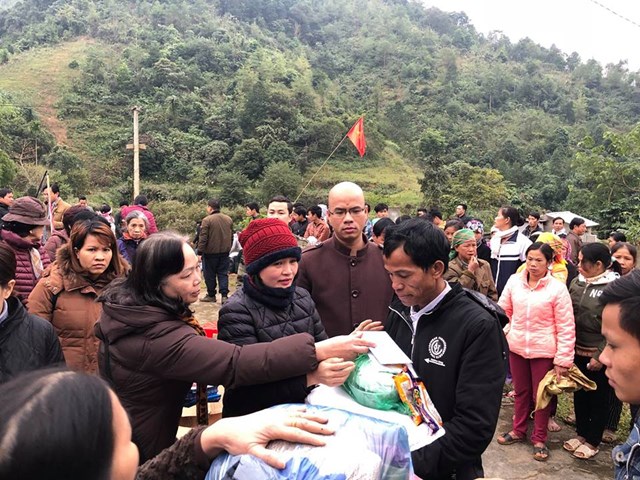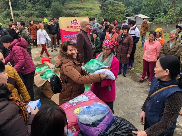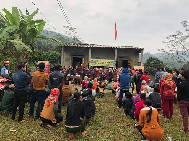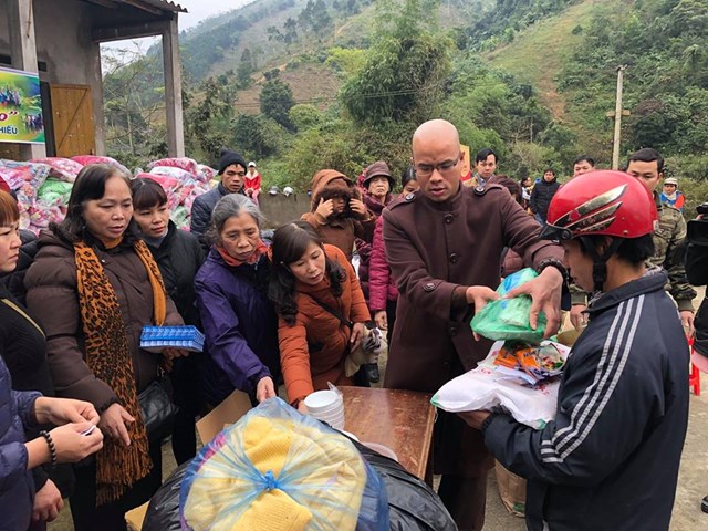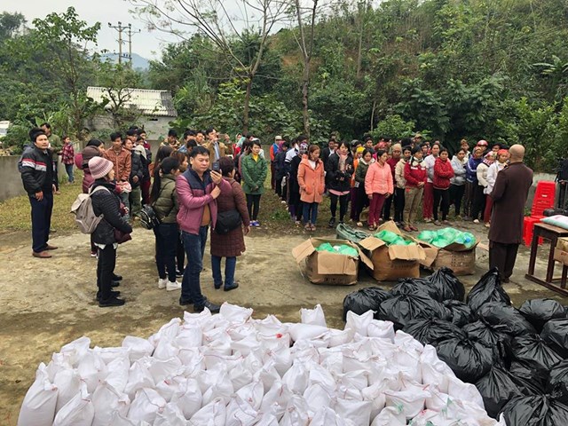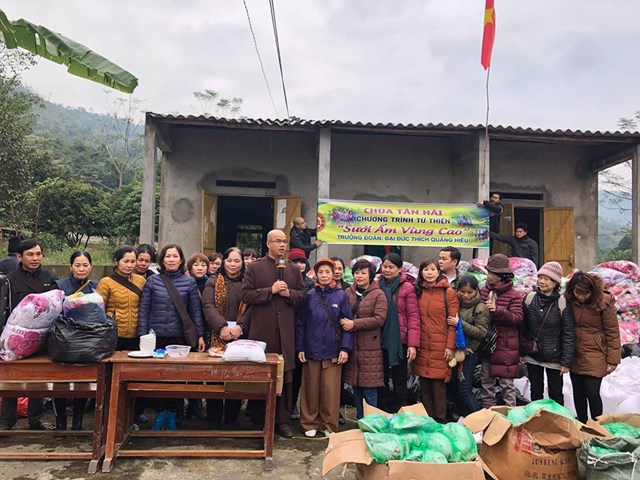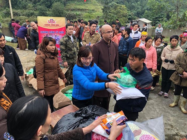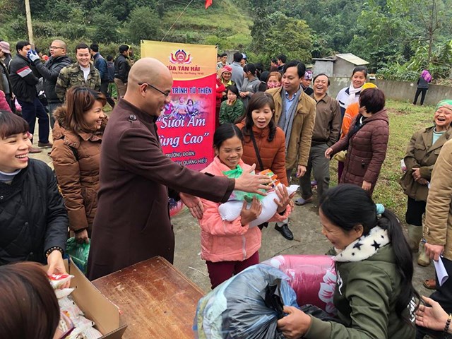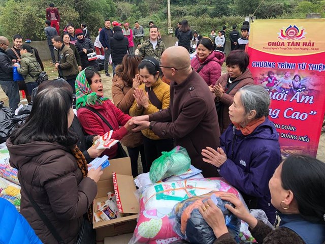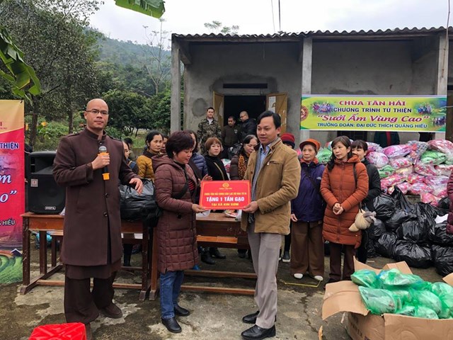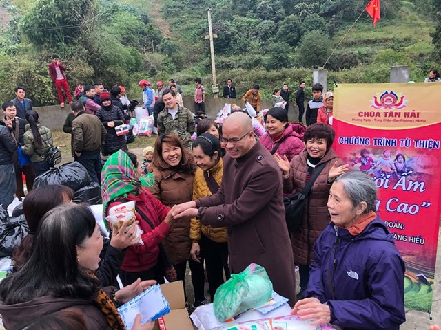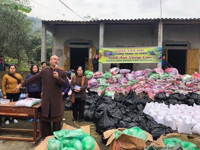 Tại đây, đoàn đã trao hơn 100 phần quà cho hơn 100 hộ dân với tổng giá trị hơn 60 triệu đồng, mỗi phần quà trị giá hơn 600 ngàn đồng bao gồm: 10kg gạo tám Điện Biên, 1kg mỳ chính, bột canh, chăn, màn, 2 bộ quần áo rét người lớn, 2 bộ quần áo rét cho trẻ em và 1 phong bì tiền mặt trị giá 200 ngàn đồng. Đại đức Thích Quảng Hiếu – Bản tự chùa Tân Hải, trưởng Ban tổ chức chương trình từ thiện đã động viên, thăm hỏi bà con vùng núi sớm vượt qua khó khăn, ổn định cuộc sống, sớm thoát khỏi cảnh đói nghèo. Những món quà này tuy nhỏ nhưng thể hiện tinh thần từ bi, cứu khổ, ban vui của người con Phật, luôn mang tình yêu thương đó trang trải khắp muôn nơi trên tinh thần “ Phật giáo luôn đồng hành cùng dân tộc” và đạo lý: “ Uống nước nhớ nguồn” từ ngàn đời nay của Dân tộc Việt Nam.
