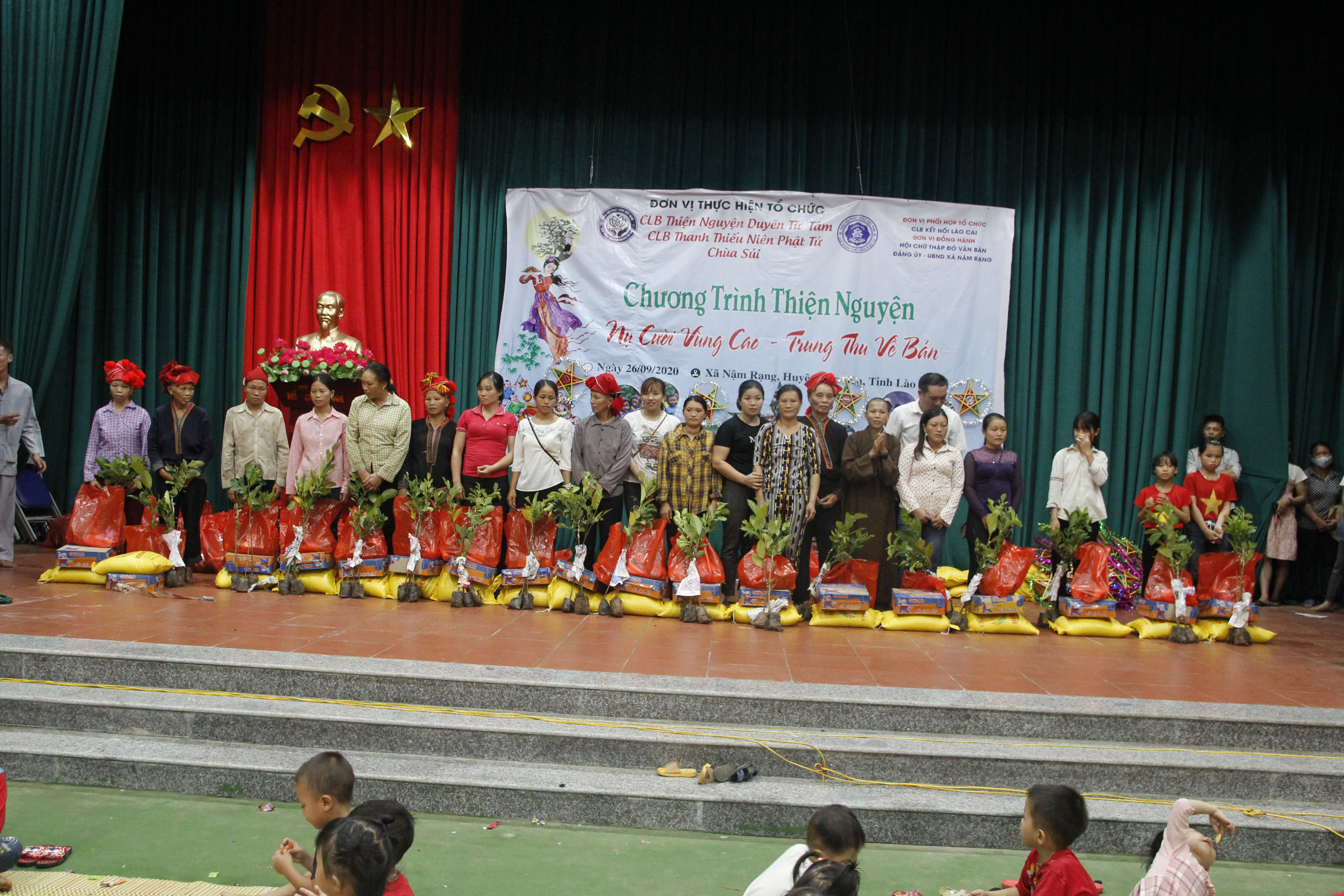Sau khi bắt đầu chương trình văn nghệ giao lưu giữa các bạn Thanh Thiếu Niên Phật Tử và các em học sinh trong Bản làng, BTC đã trao tặng 200 xuất quà cho các em nhỏ gồm : 1 Cặp sách, 1 áo phao ấm, 1 đôi ủng, 1 bánh Trung thu, 5 đôi tất và trao tặng 30 xuất quà cho các hộ gia đình có hoàn cảnh đặc biệt khó khăn gồm : 10kg gạo, 1 chai dầu ăn, 1 thùng mì tôm, 1 kg muối, bột canh và 3 loại cây giống ăn quả .