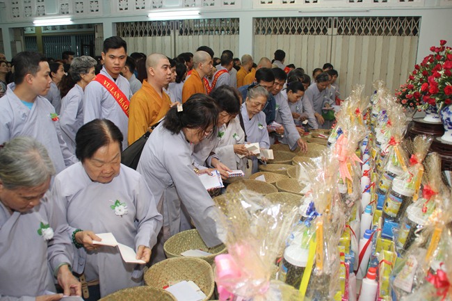 Cuối buổi lễ cài hoa hồng và dâng pháp y còn có lễ cúng dường chư tăng nhằm hồi hướng công lao cho hai đấng sinh thành.