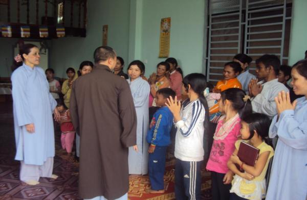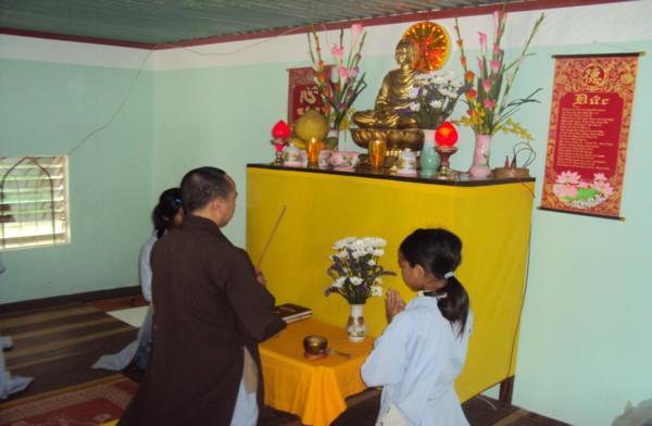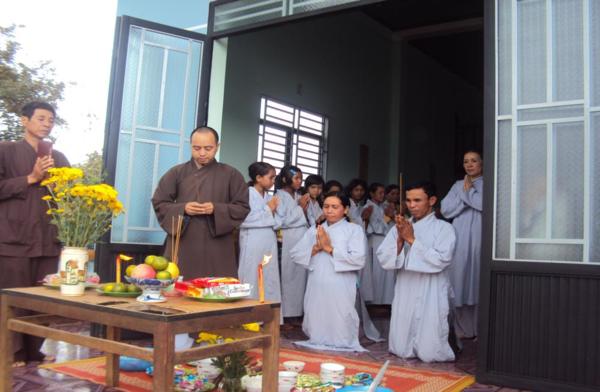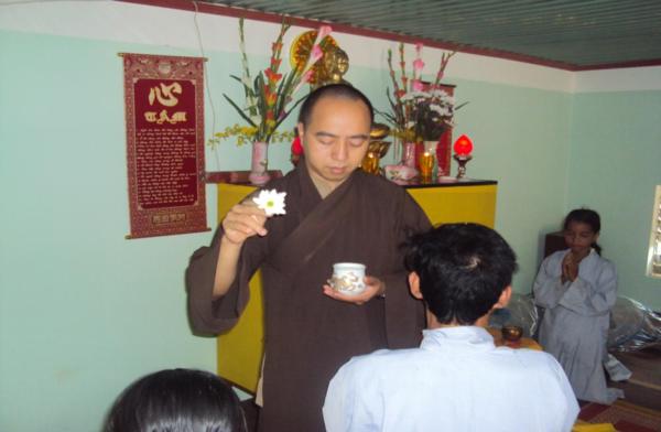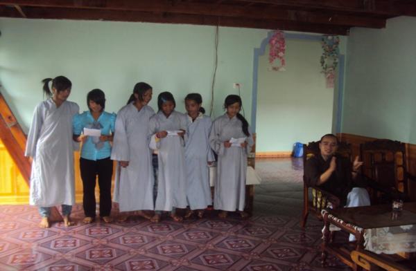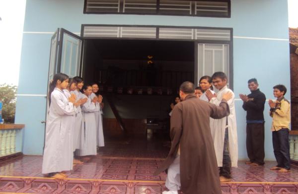 Sau khi làm lễ an vị Phật cho gia đình anh Ama Miêu . ĐĐ Thích Minh Đăng, Chánh Đại Diện Huyện Hội đã tán thán công đức của gia đình Ama Miêu trong việc ủng hộ Phật pháp nơi vùng sâu, vùng xa . Bằng những lời đơn giản và dễ hiểu thầy đã hướng dẫn cho bà con trong buôn những điều cần thiết trong việc sinh hoạt Phật pháp phù hợp với Pháp luật hiện hành và hiến chương của giáo hội PGVN. Thầy giảng về Tam Quy, Ngũ Giới cho bà con đồng bào, đặc biệt thầy rất quan tâm đến các em học sinh , thầy động viên các em phải cố gắng học hành thành đạt, để sau này trở thành người có ích cho xã hội và giúp đỡ cho buôn làng mình có cuộc sống an vui , tốt đẹp hơn. Nếu em nào có hoàn cảnh quá khó khăn trong học tập thì thầy sẽ nhận đem về chùa nuôi ăn học cho đến lúc thành tài. Riêng trong năm nay , em nào học tập tốt và đạo đức tốt thì thầy sẽ có những món quà tặng xứng đáng.