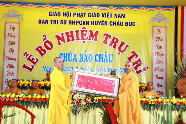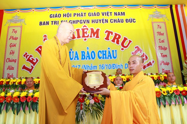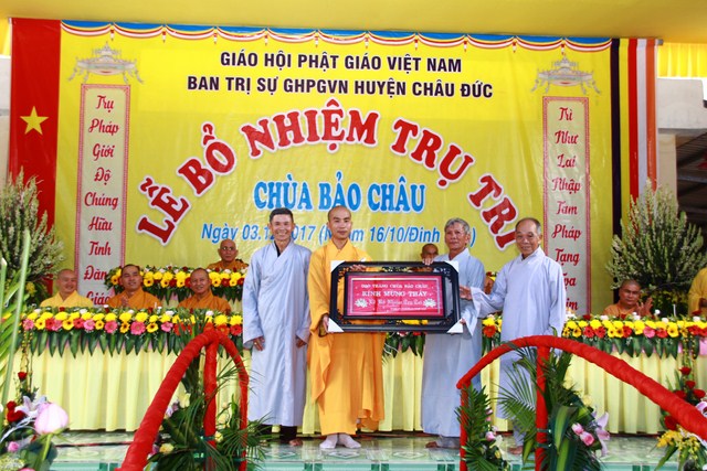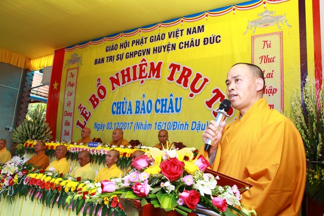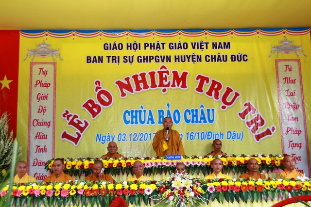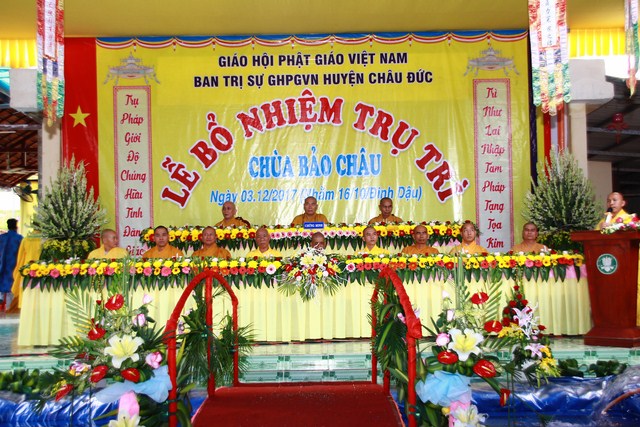 Đại đức Thích Thiện Thông Phó thư ký kiêm Chánh Văn phòng Ban Trị sự GHPGVN tỉnh Bà Rịa Vũng Tàu tuyên đọc quyết định số 513/QĐ/BTS của Ban Trị sự GHPGVN tỉnh Bà Rịa Vũng Tàu do HT Thích Quảng Hiển Trưởng Ban Trị sự GHPGVN tỉnh ấn ký ngày 10/10/2017 V/v Bổ nhiệm Đại đức Thích Trung Tuệ đảm nhận Phật sự Trụ trì chùa Bảo Châu thuộc Ấp Liên Sơn xã Xà Bang huyện Châu Đức