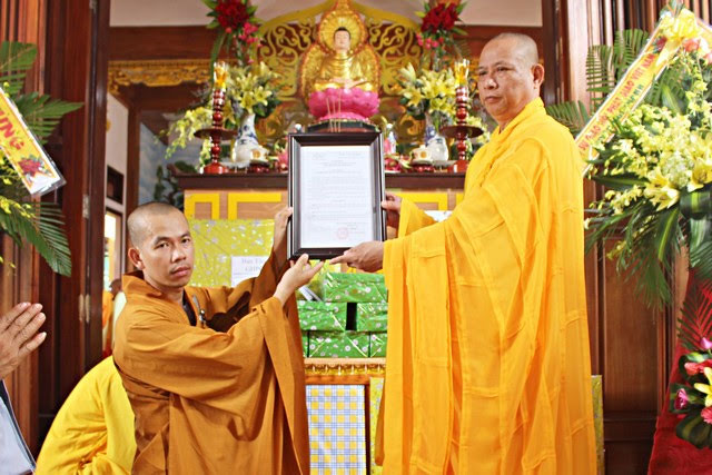 Tại buổi lễ, ĐĐ.Thích Viên Quán, Phó thư ký kiêm Chánh văn phòng BTS PG tỉnh công bố Quyết định bổ nhiệm ĐĐ.Thích Vinh Toàn làm trụ trì chùa Từ Quang (xã Tam Tiến); TT.Thích Phước Minh trao quyết định và tặng lẵng hoa chúc mừng đến Đại đức tân trụ trì.