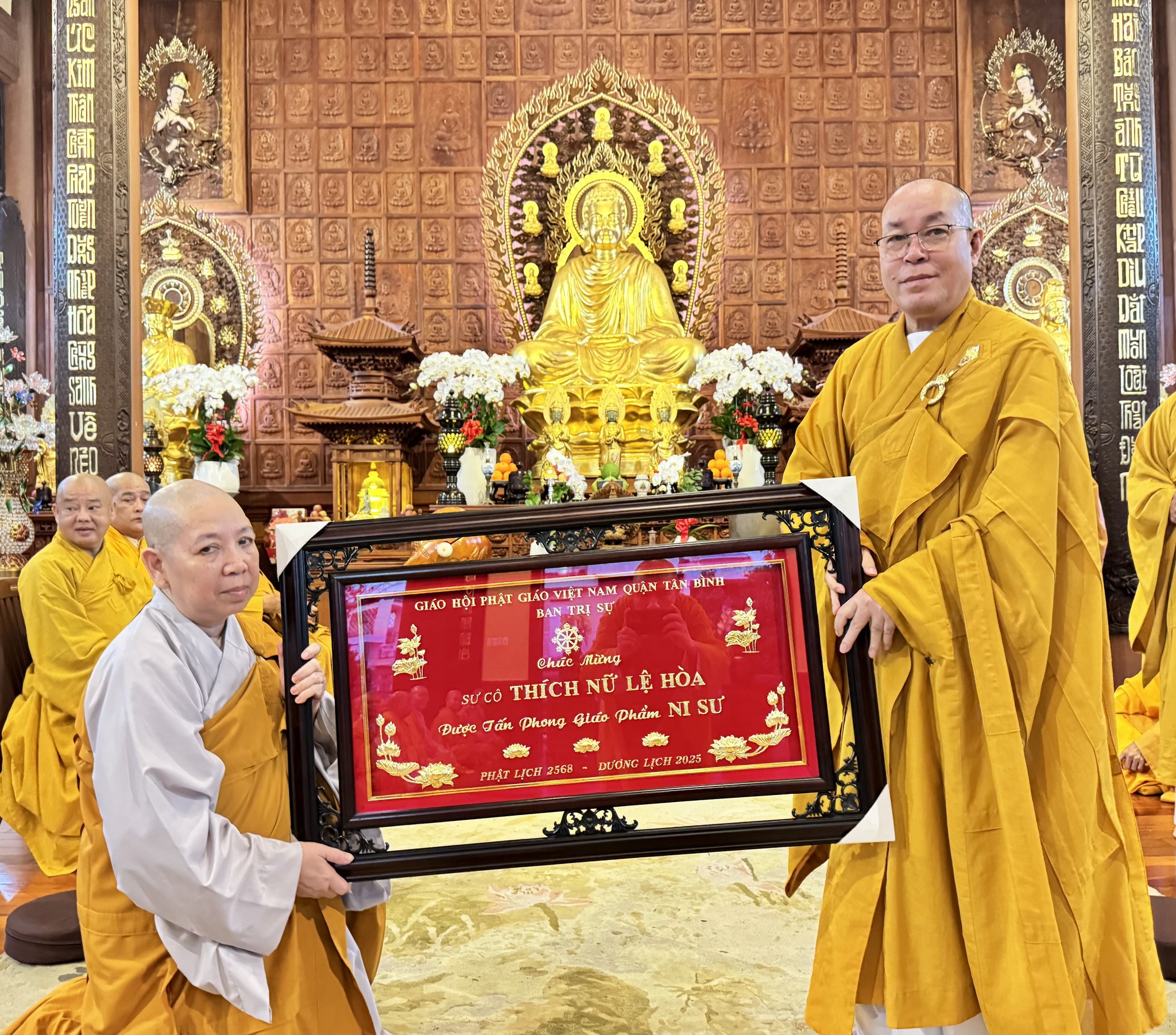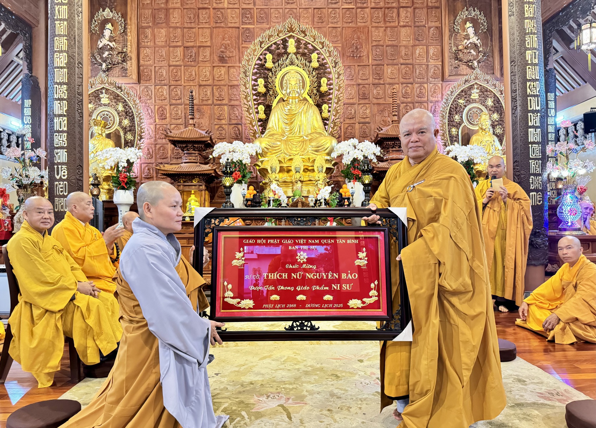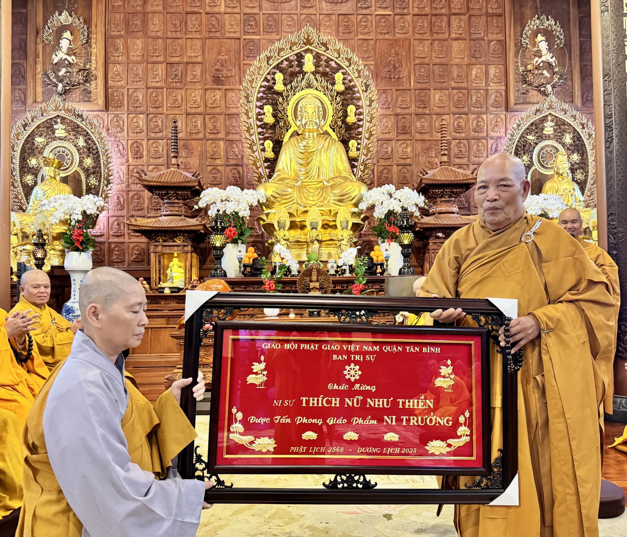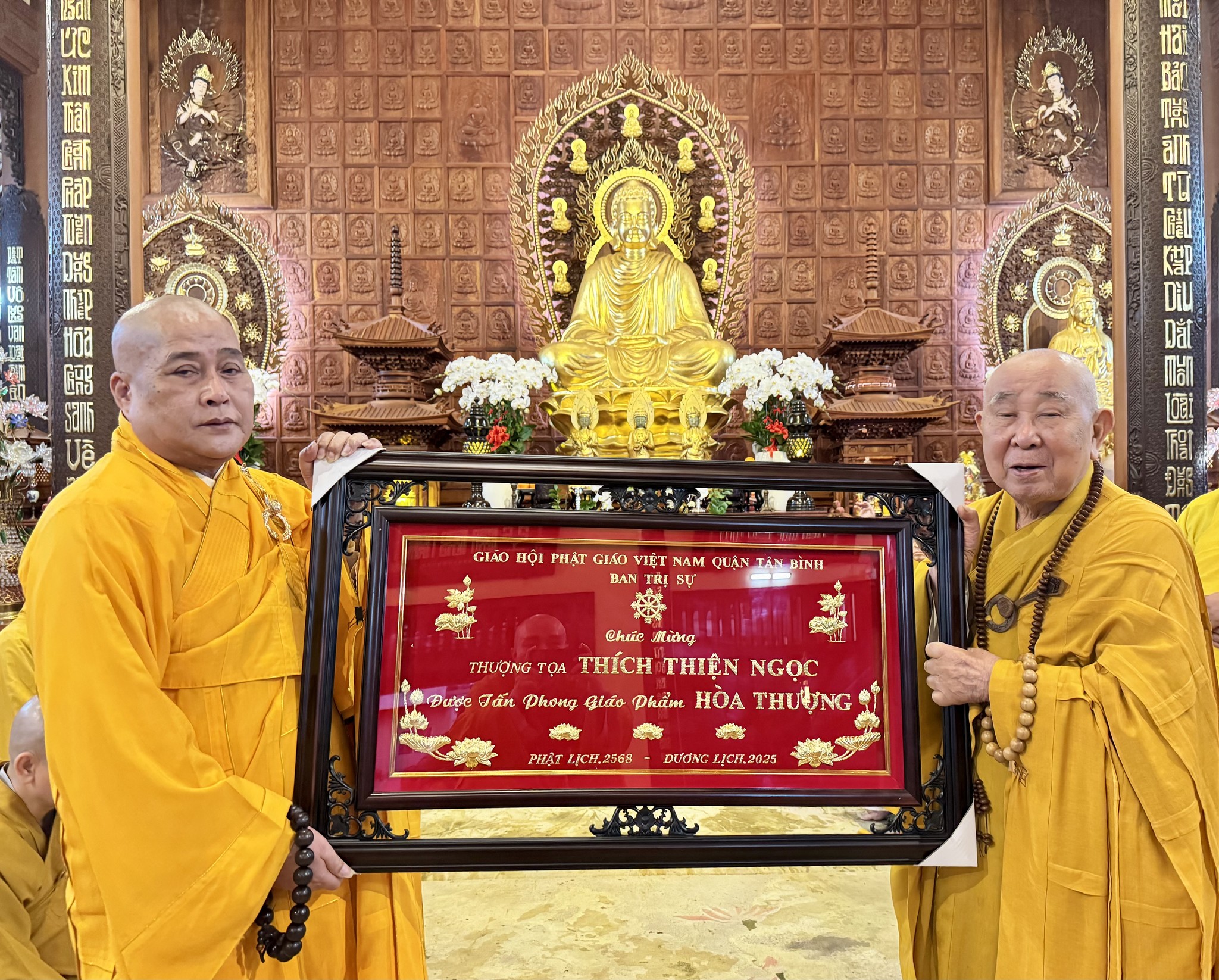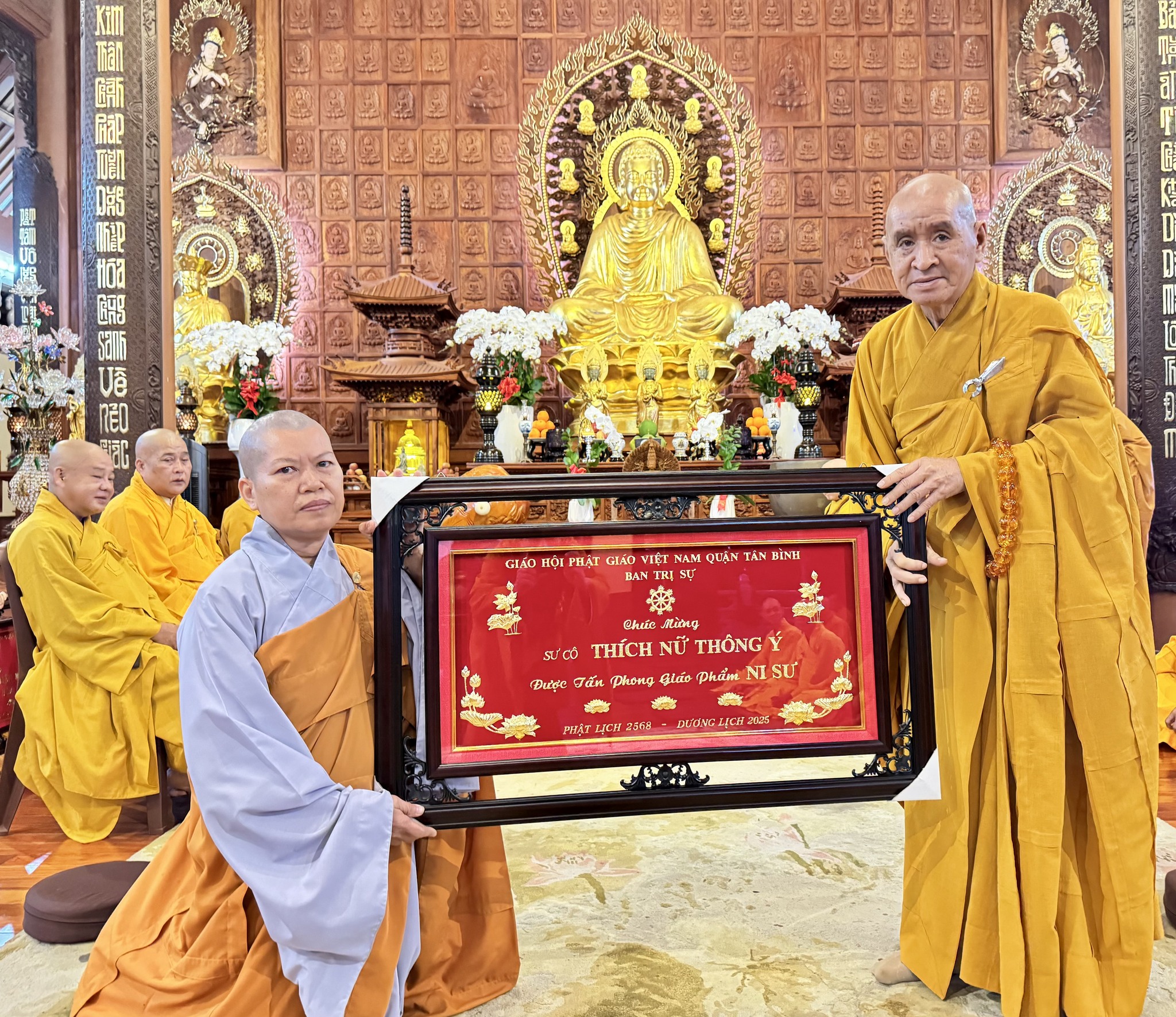 Dịp này, Ban Trị sự cũng đã trao khánh vàng chúc mừng đến chư tôn đức Tăng Ni được tấn phong giáo phẩm trong Nghị quyết số 25/NQ-HĐCM vừa qua của Ban Thường trực Hội đồng Chứng minh GHPGVN.