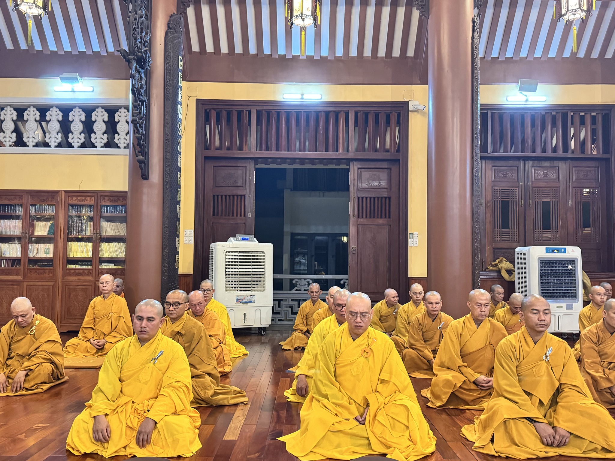 Sau buổi lễ, chư tôn đức lắng nghe lời sách tấn từ Trưởng lão Hòa thượng Chứng minh và thông báo những hoạt động Phật sự sắp tới từ Thượng tọa Thích Đạt Đức, Trưởng ban Trị sự GHPGVN Q.Tân Bình.