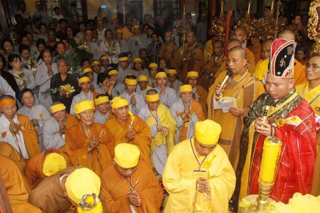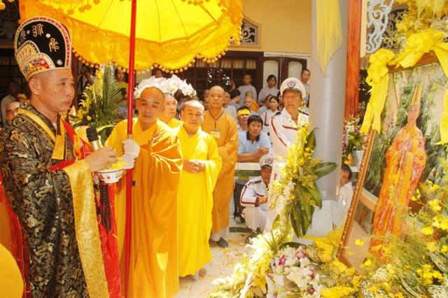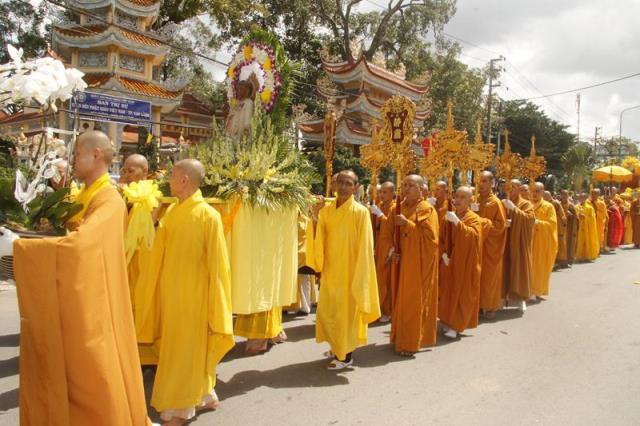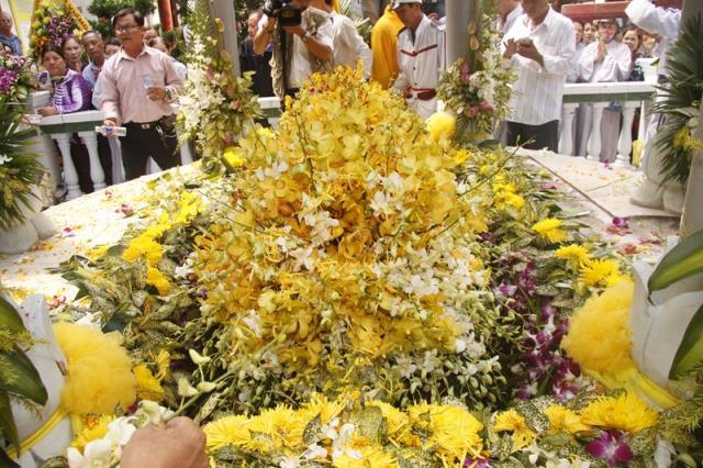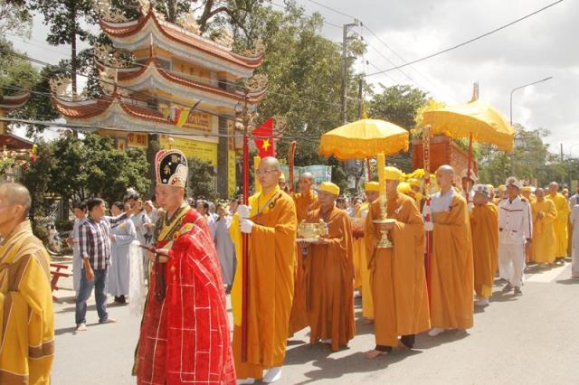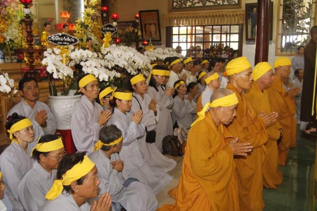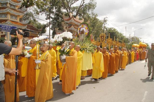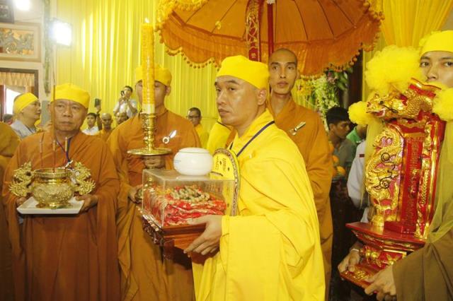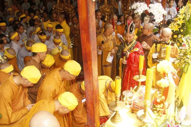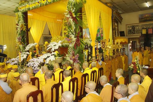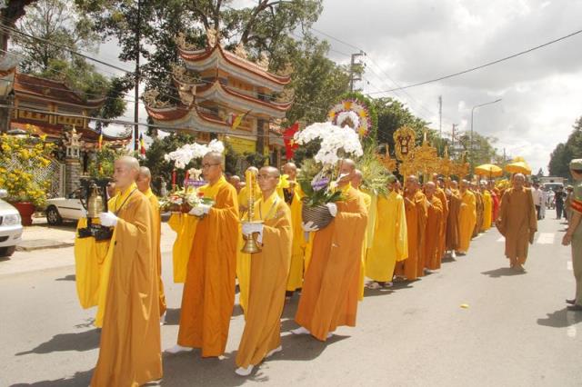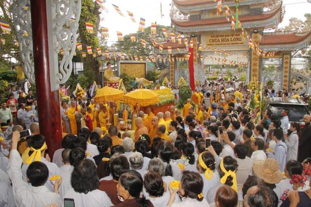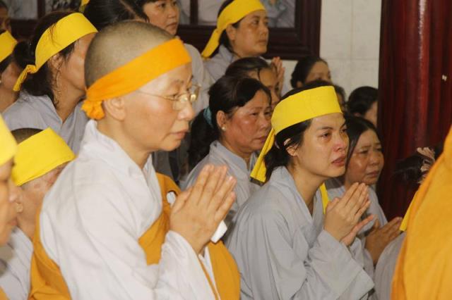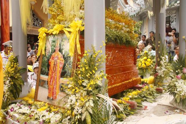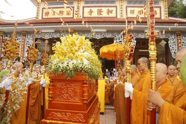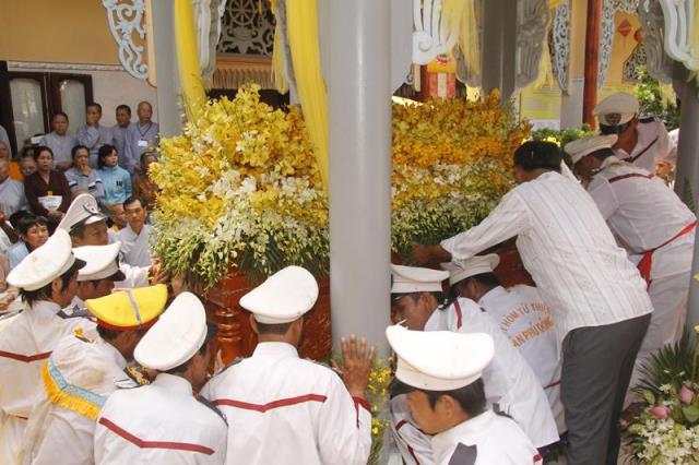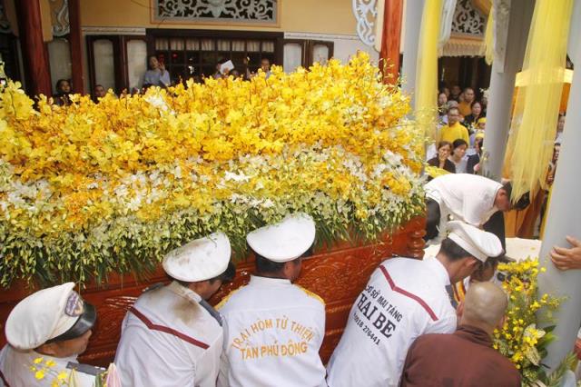 Trong tiếng niệm Phật trầm hùng, đoàn phụng nghinh kim quan tiến về phía trước chánh điện, cử hành lễ trà tỳ, sau đó thỉnh kim quan nhập bảo tháp.