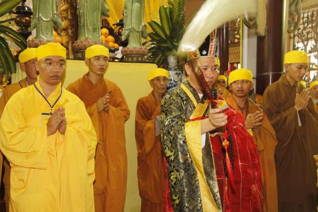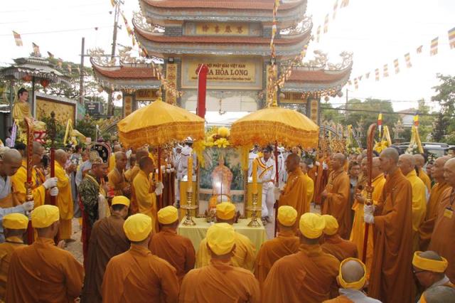 Sau cùng, Đại Đức Thích Thiện Chí – Trưởng Ban Nghi Lễ GHPGVN tỉnh Đồng Tháp đương vi Sám chủ, cử phất trần, sái tịnh, tiến hành nghi thức phụng thỉnh Linh mô, kim quan nhập bảo tháp tại khuôn viên chùa Hoà Long.