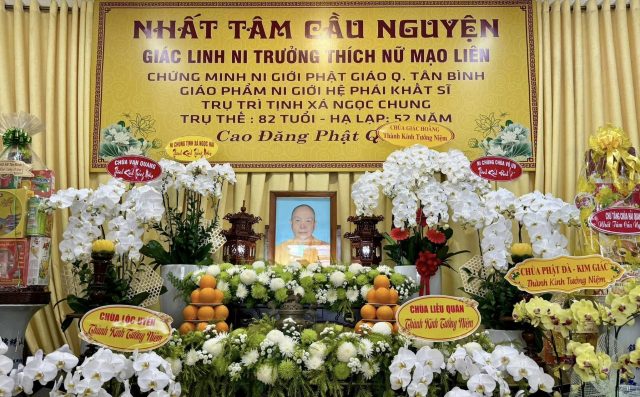 Sáng 27-9 (25-8-Giáp Thìn), môn đồ pháp quyến đã trang nghiêm tổ chức lễ Đại tường Ni trưởng Thích nữ Mạo Liên, Chứng minh Ni giới Phật giáo Q.Tân Bình, Giáo phẩm Ni giới hệ phái Khất sĩ, viện chủ tịnh xá Ngọc Chung (P.8, Q.Tân Bình).