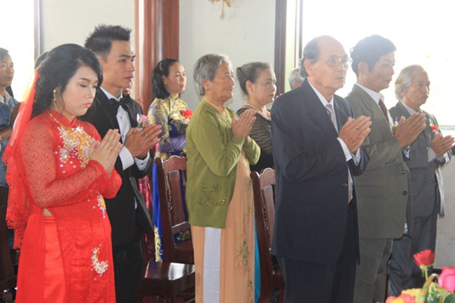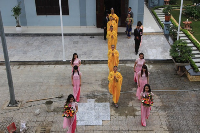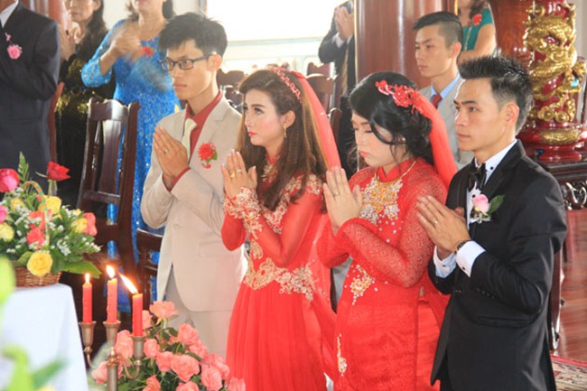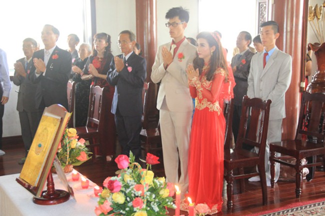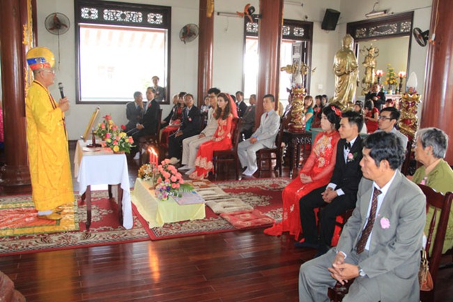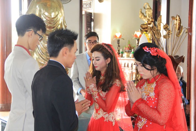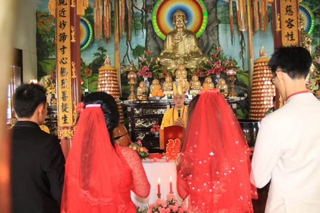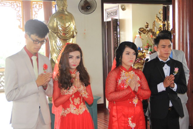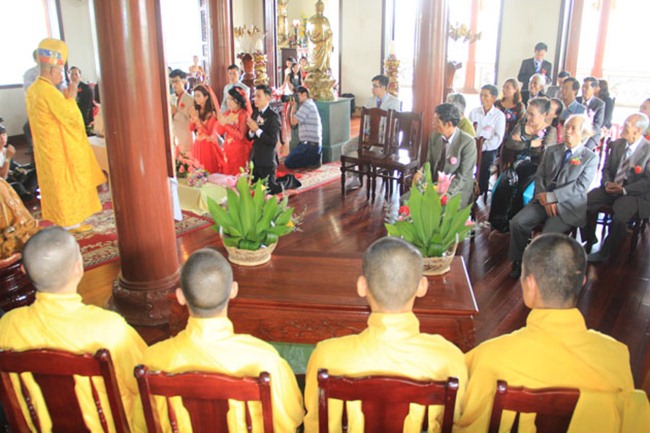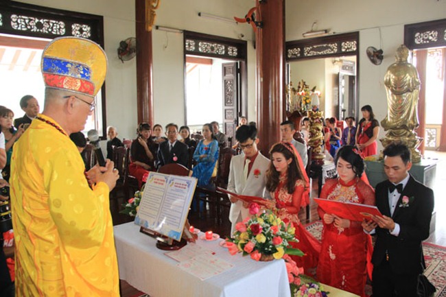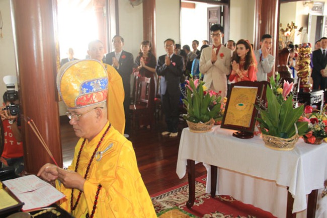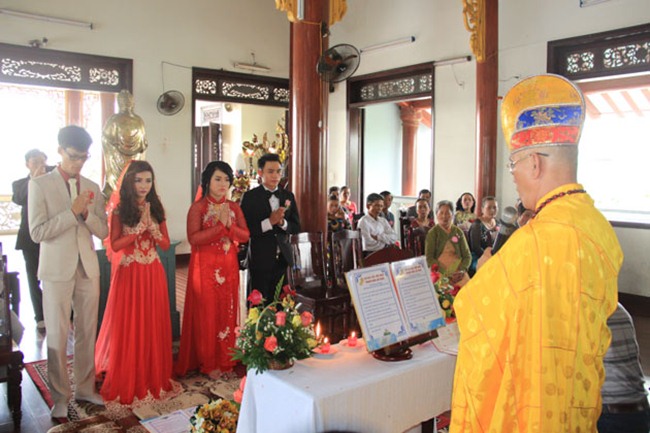 Nhẫn cưới đã được Hòa thượng trao cho 2 đôi tân hôn trong niềm hoan hỷ với lời chúc phúc. Trước Tam Bảo, 2 đôi tân hôn đã dâng lời phát nguyện sống theo lời Phật dạy, giữ gìn 5 giới của người Phật tử tại gia, xây dựng gia đình trên nền tảng đạo đức của người con Phật, người huynh trưởng Gia đình Phật tử.