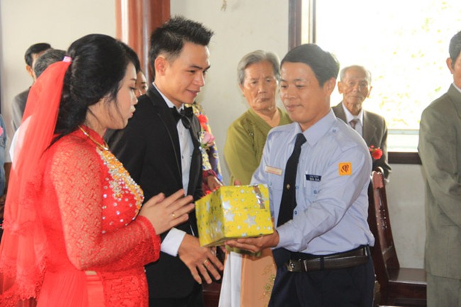 Đại diện Ban huynh trưởng GĐPT Bà Đa cũng đã trao tặng 2 đôi bạn trẻ những món quà thắm tình lam trong ngày trọng đại này.