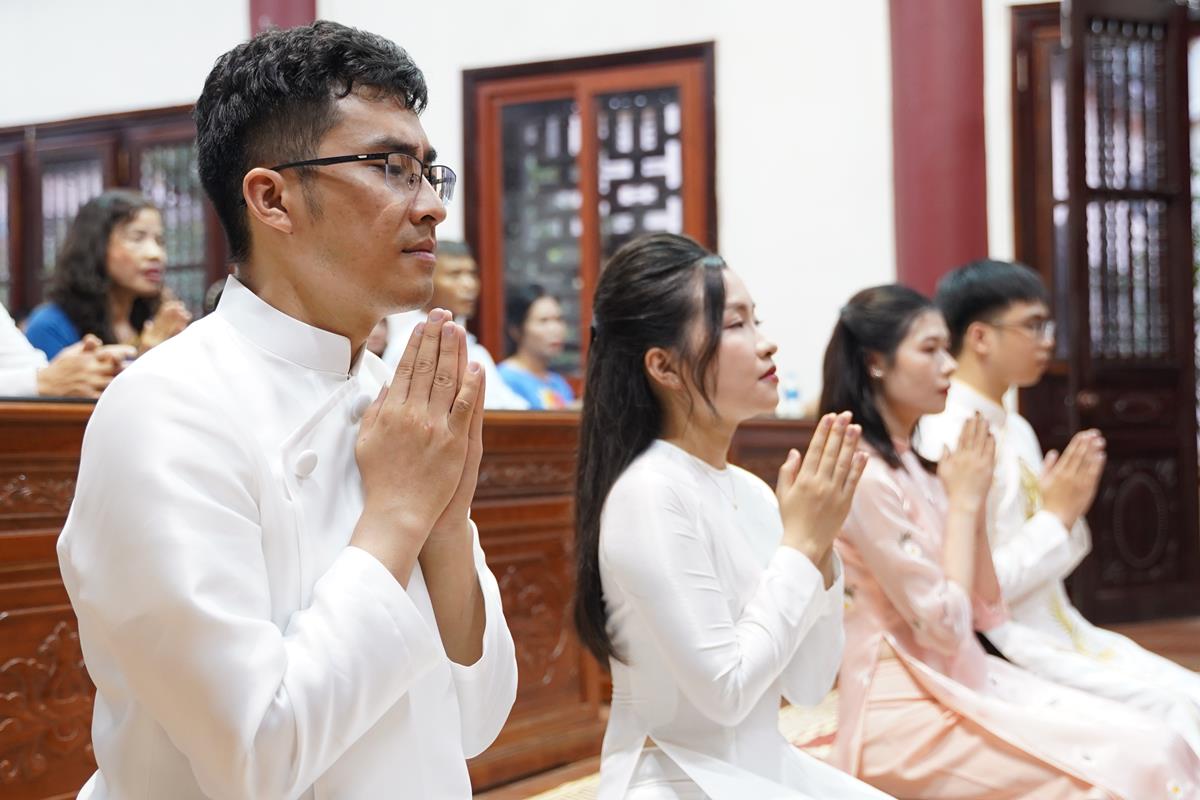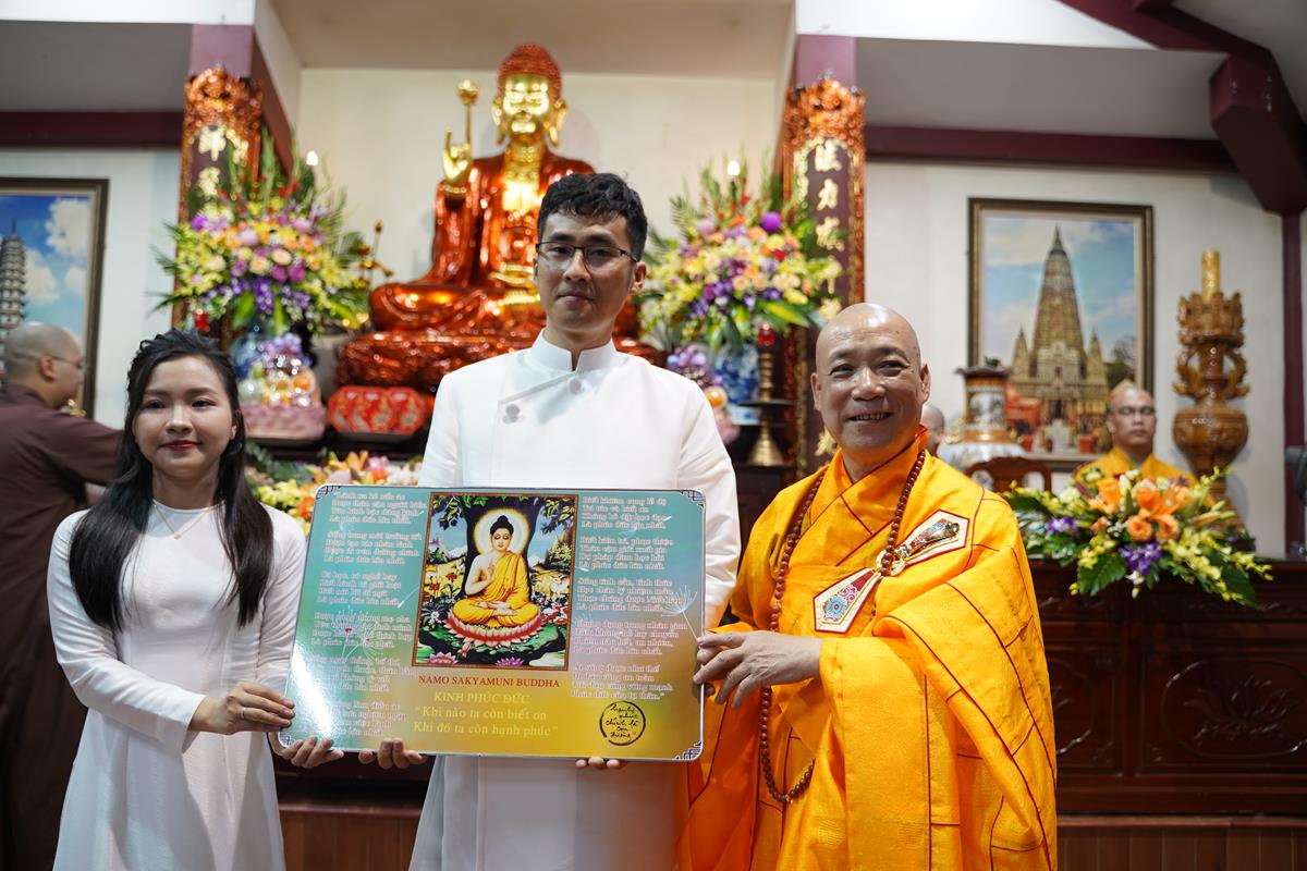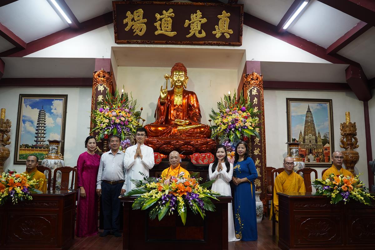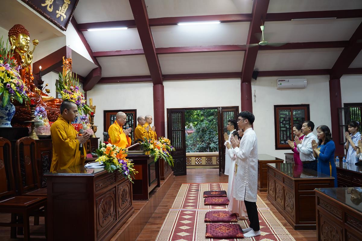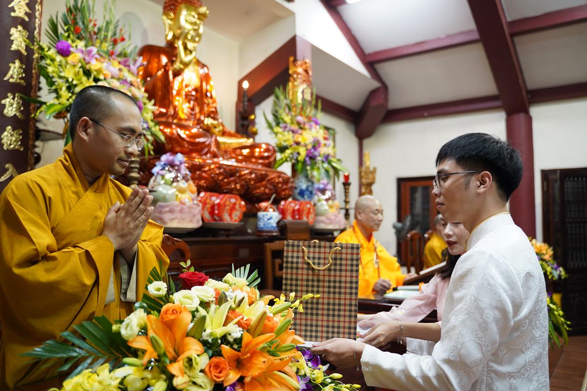 Cuối buổi lễ, Hòa thượng trụ trì cùng chư tôn đức và toàn thể đại chúng đã thành kính làm lễ cầu nguyện chúc phúc cho hai đôi trẻ “trăm năm tình viên mãn, bạc đầu nghĩa phu thê”.