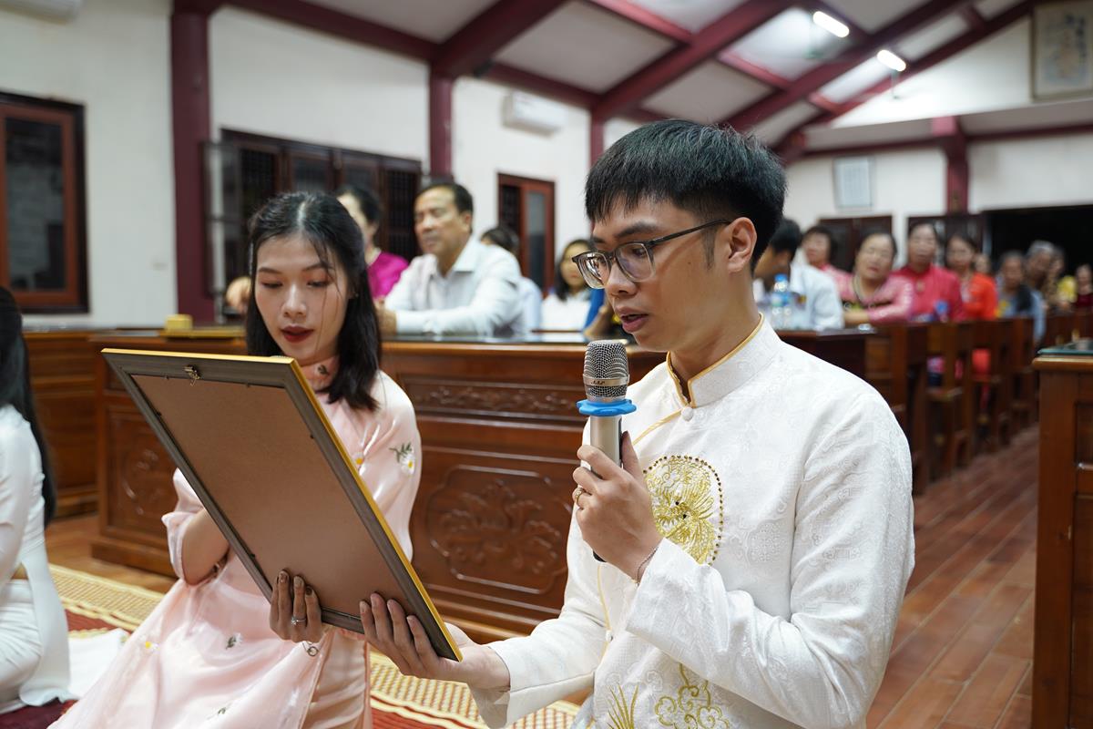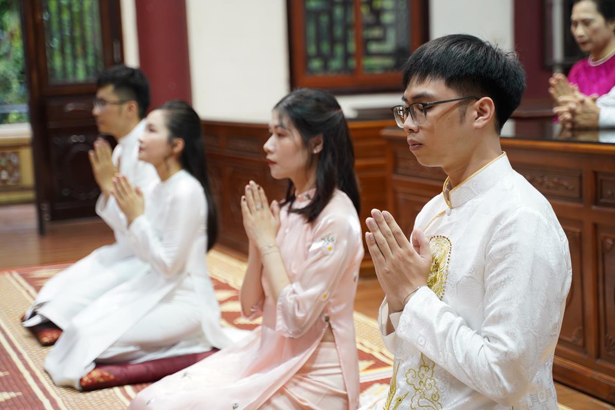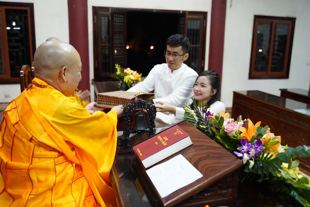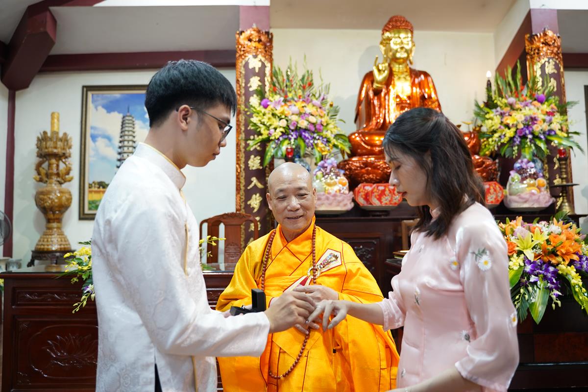 Tiếp theo, hai đôi bạn trẻ đã trao nhẫn cưới cho nhau trước sự chứng minh chúc phúc của chư tôn đức, cùng lễ tạ Tam Bảo, tạ ơn cha mẹ và hành lễ với nhau tôn trọng sự bình đẳng. Trong không gian thiêng liêng, hai đôi bạn trẻ đã đối trước chư tôn đức đọc lời thệ nguyện kết hôn.