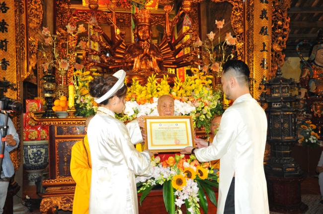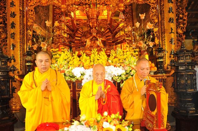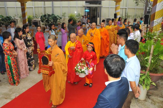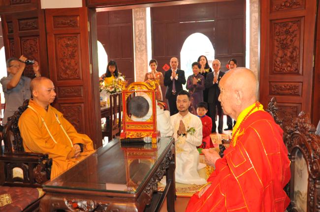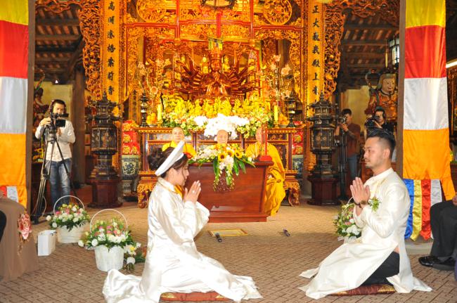 Trước khi cử hành nghi lễ hằng thuận, chư tôn đức chứng minh cùng toàn thể đại chúng đã đối trước Phật đài niêm hương bạch Phật, cầu nguyện chúc phúc cho đôi bạn trẻ. Sau đó, đôi bạn trẻ đã được Hòa thượng Thích Thanh Đàm, Thượng tọa Thích Chiếu Tuệ và chư Tăng Ni tác pháp quy y Tam Bảo và trao truyền Ngũ Giới để làm kim chỉ nam cho cuộc sống hiện tại.