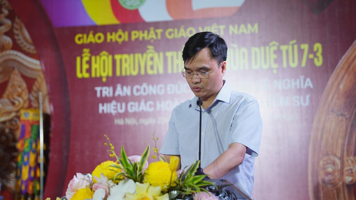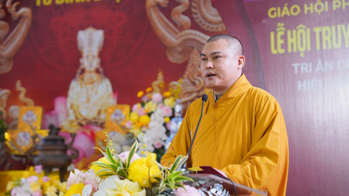Sau hồi trống hội vang lên hùng tráng, đại chúng trang nghiêm lắng lòng nghe  Đại đức Thích Chân Tín – Ủy viên HĐTS, Phó Trưởng Ban Hướng dẫn Phật tử TW GHPGVN cung tuyên sơ lược thần tích của Thánh Tổ.