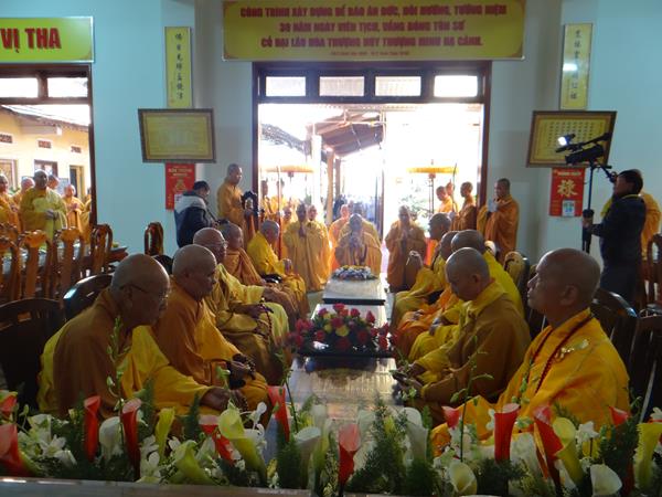 Dưới sự chứng minh của chư tôn thiền đức nhị bộ tăng già, sau phần kính dâng lục cúng, thay lời môn đồ pháp quyến, TT. Thích Thanh Tâm đã dâng lời cảm niệm Tôn Sư : “ Ba thập niên qua vắng bóng Tôn Sư, 30 năm mà hình ảnh Thầy đã biền biệt trên mãnh đất mù sương, lạnh buốt, trong mái chùa cổ kinh này mà âm vang bất diệt, vang vọng mãi trong tâm khảm của chúng con … nhớ khi xưa, trong từng câu kinh, tiếng kệ, trong nhịp mõ hồi chuông, bóng thầy đứng giữa thiền môn, giọng Thầy cử tán “ Tâm Nhiên Ngũ Phận” … cuộc đời Thầy thật giản dị, sống đạm bạc đơn sơ, nhưng thật uyên thâm, như bậc thiền sư đạo cao đức trọng . Thầy đã đến và đi giữa cuộc đời này, làm đẹp cho vườn hoa chư Tổ – hạnh nguyện cùng hành trang của Thầy làm cho hàng môn đồ đệ tử chúng con, không ai mà không kính trọng, mến mộ uy đức của Thầy …” ( trích lời cảm niệm tôn sư) .