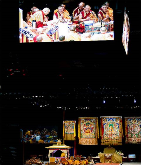 Trên lễ đài, từ rất sớm, Đức Đạt Lai Lạt Ma cùng chư Tăng Kinh sư Tibet đã làm lễ Tịnh thổ rất nghiêm trang, thành khẩn.