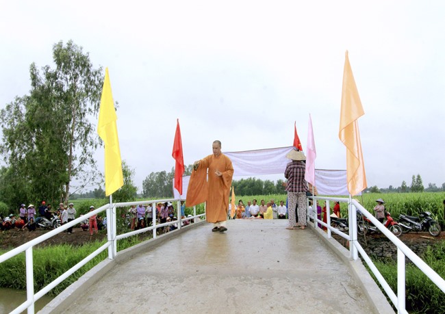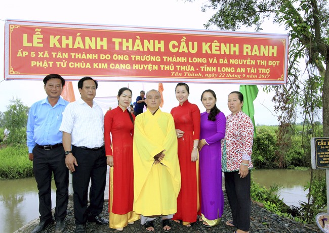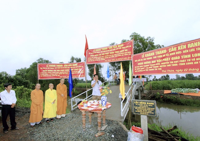 Nhân dịp dự Lễ khánh thành cầu, hướng tới chào mừng ĐẠI HỘI PHẬT GIÁO TỈNH LONG AN khóa IX 2017-2022, nhà tài trợ – Phật tử Lâm Quang Lễ cũng phát tâm tặng 100 suất quà, mỗi phần trị giá 270.000 đồng cho bà con địa phương có hoàn cảnh khó khăn; và cùng Ban Từ thiện đến thăm hai chị em bà cụ già neo đơn không người thân (chị 95 tuổi – em 90 tuổi), tặng 50 ký gạo, 5 thùng mì, đường, dầu, nước tương và tiền mặt 1.000.000đ (một triệu đồng).