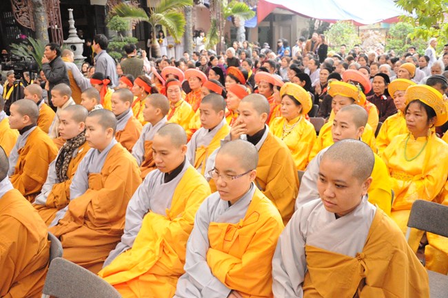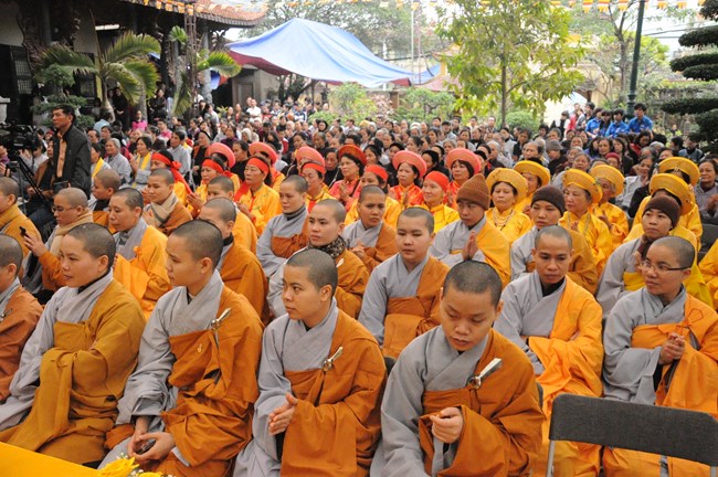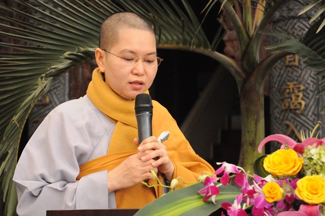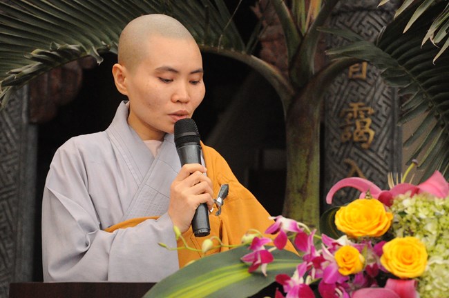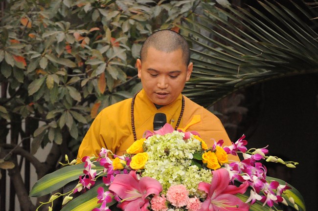 Mở đầu chương trình là lời phát biểu khai mạc của Sư cô trụ trì Thích Đồng Hòa. Bài phát biểu đã khẳng định “Trong nhịp sống hối hả vật lộn mưu sinh để tìm ra bát cơm manh áo, con người chúng ta phần nhiều bị phụ thuộc vào tài sản, sắc đẹp, danh vọng, chìm đắm trong đêm dài vô minh không lối thoát, giữa biển khổ mênh mông với từng đợt sóng ngầm dồn dập đưa đẩy, là hình ảnh minh họa rất sống động về sự sinh diệt diệt sinh bất tận tiếp diễn trong nhiều kiếp đã làm cho các bậc Thánh nhân khởi tâm từ bi thương xót. Cũng do nhân duyên đó, vô lượng chư Phật đã xuất hiện cùng với bản nguyện đó là: Khai thị chúng sinh ngộ nhập được tri kiến của Phật, như lời kinh Pháp Hoa đã nói thật đúng với câu, nếu cõi đời không đau khổ tối tăm, Đức Phật đã chẳng xuất hiện ở đời. Phật thành đạo không chỉ là một cuộc chinh phục vĩ đại, một chiến thắng vẻ vang đối với bản thân Ngài mà còn là một sự khai sáng tuyệt vời cho hết thảy nhân loại, chúng sinh“.